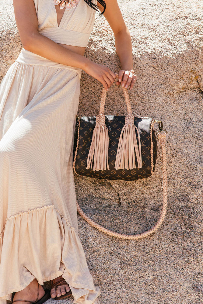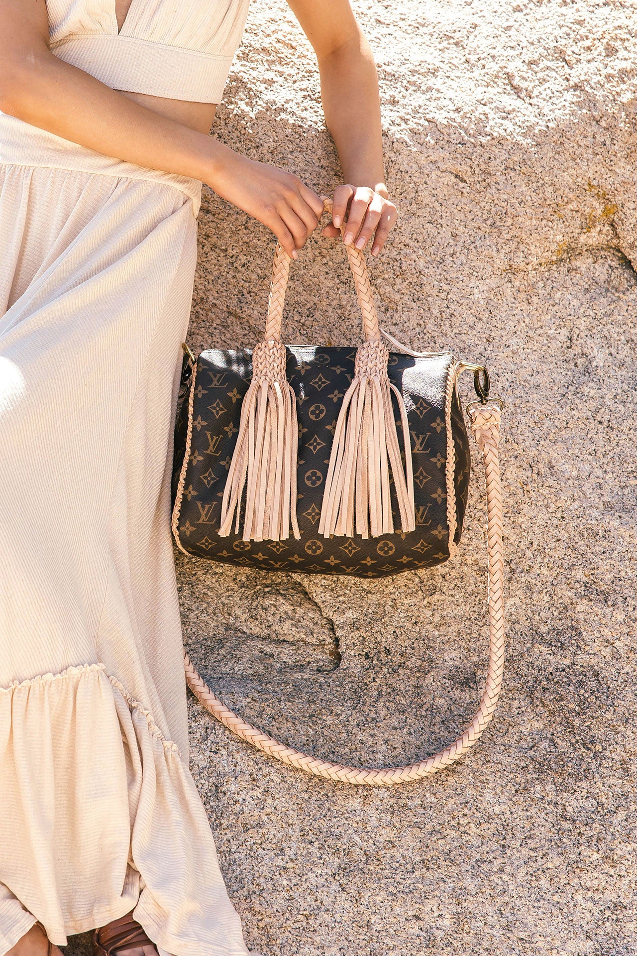 This iconic bag has an unmistakable shape and unites timeless design with our heritage details while being lightweight and very roomy. Tailor-made and hand-braided natural cowhide trim and rolled comfortable handles slip easily over the arm, with a detachable shoulder or cross body strap for the epitome of a classic made Boho-chic and more comfortable.