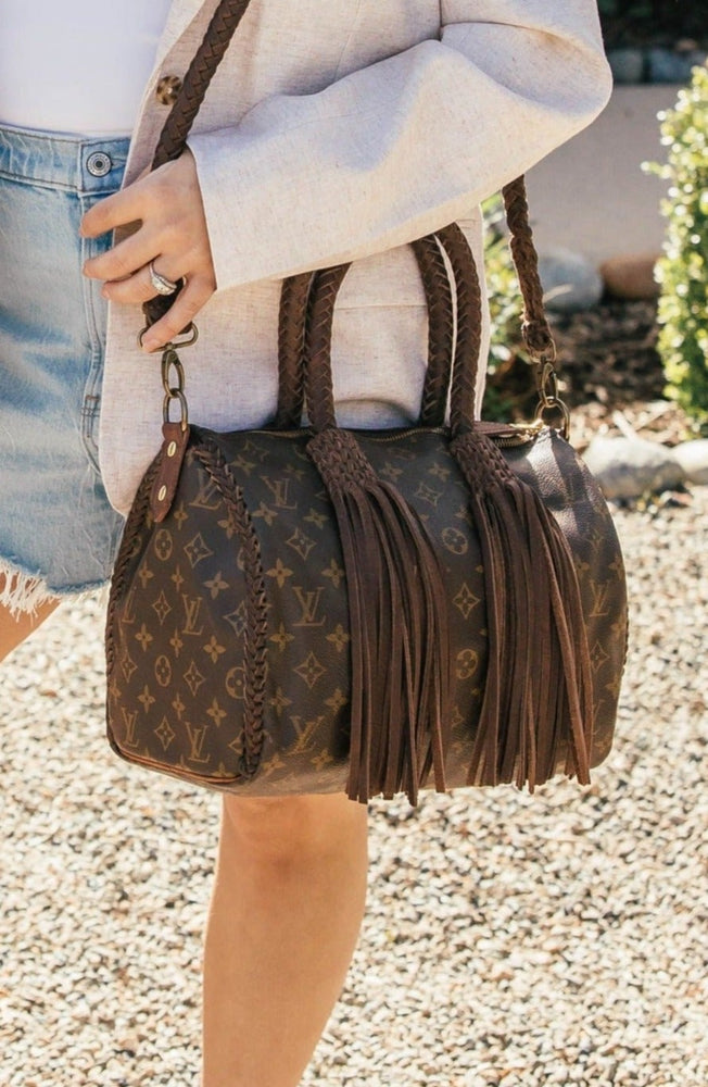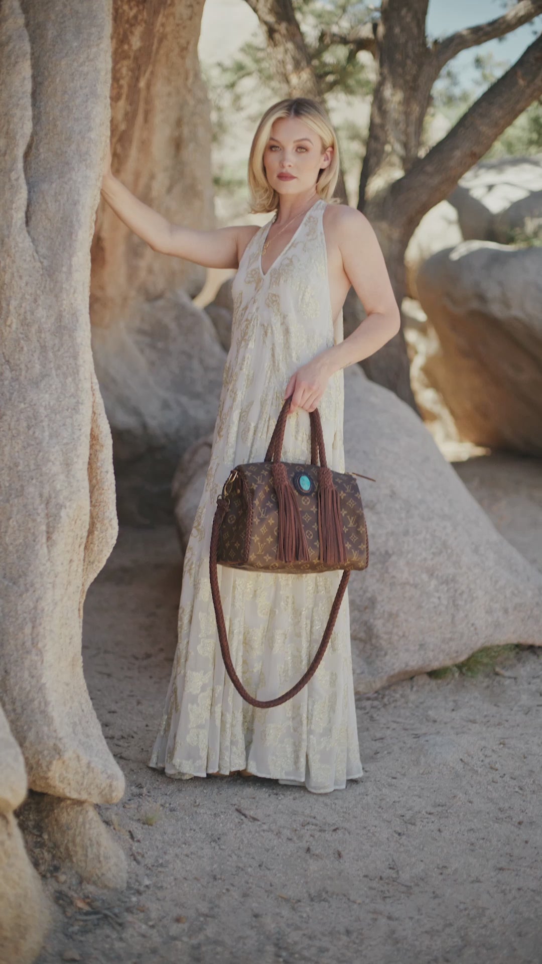 This iconic bag has an unmistakable shape and unites timeless design with our heritage details while being lightweight and very roomy. Tailor-made and hand-braided natural cowhide trim and rolled comfortable handles slip easily over the arm, with a detachable shoulder or cross body strap for the epitome of a classic made boho-chic and more comfortable.