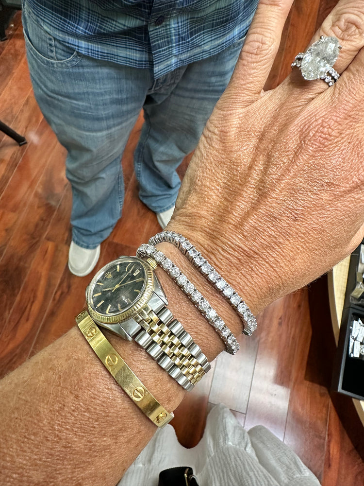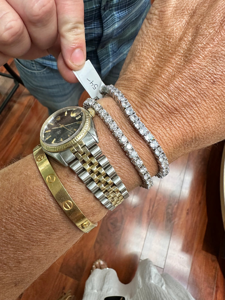 A timeless elegant eye-catching diamond tennis bracelet. Adorned with simulated round zirconia crystals. The 7" bracelet, features a tongue clasp ensuring a secure fit.