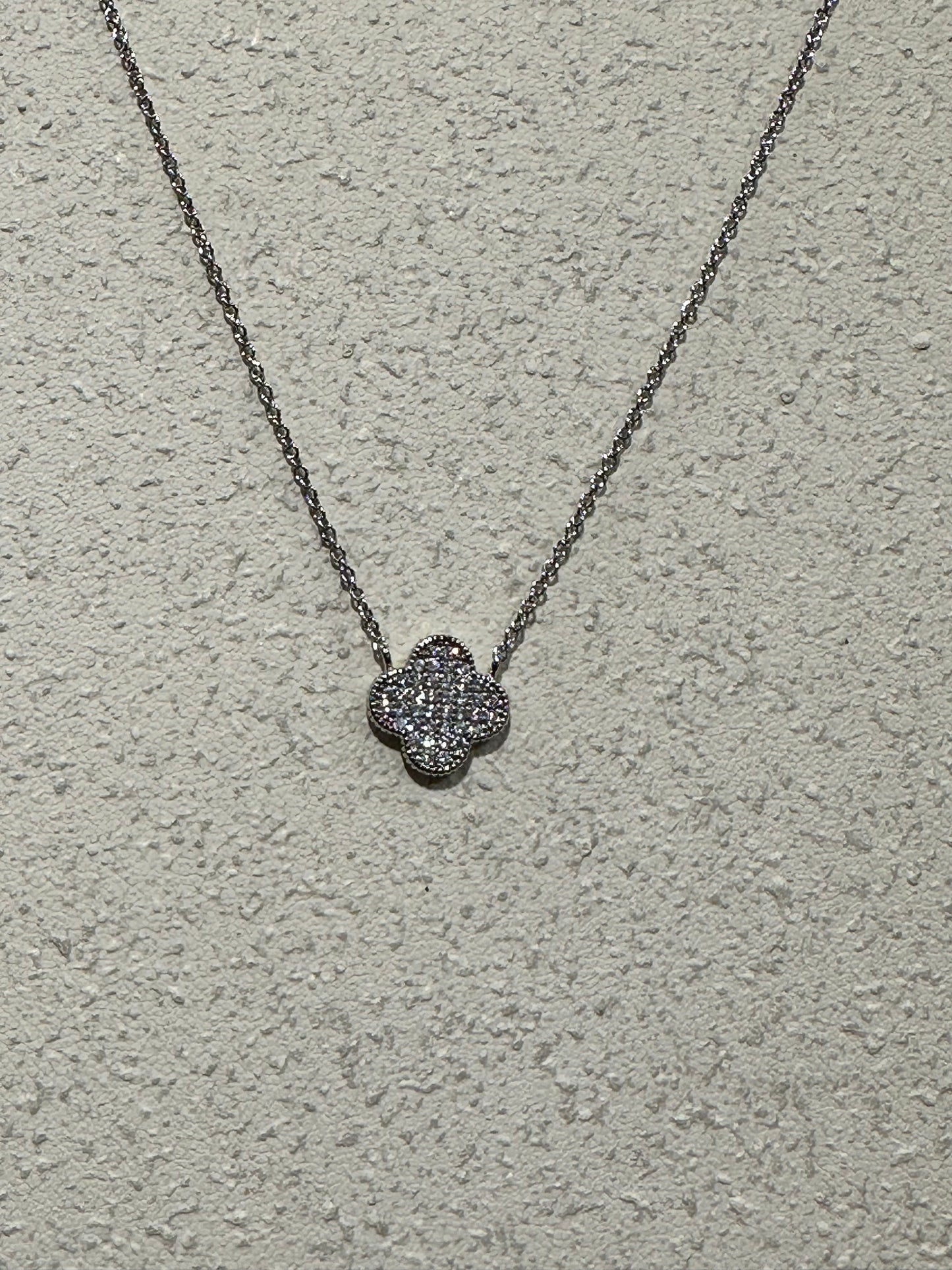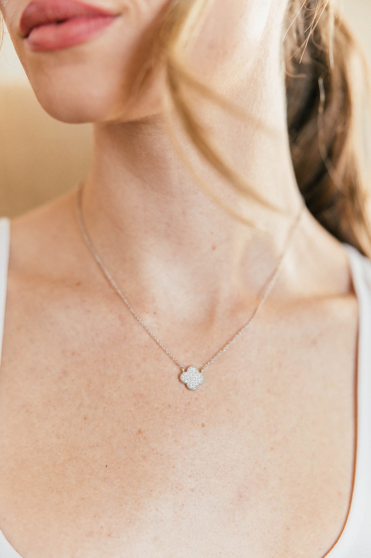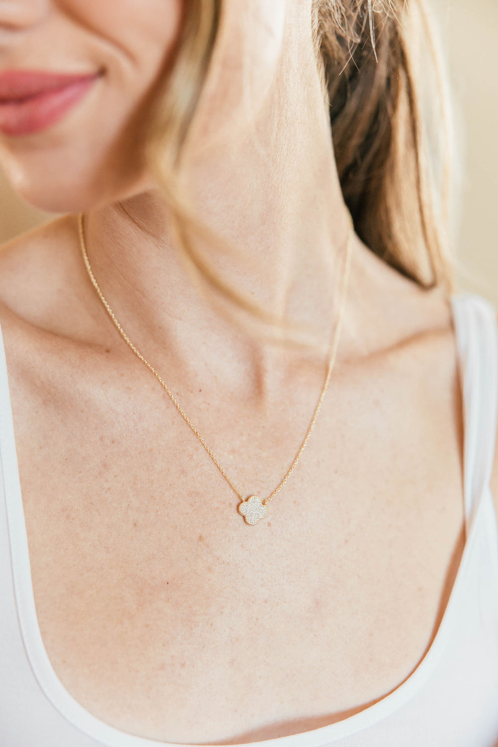 This gorgeous necklace features a delicate 14k gold-plated chain with pavé inlay in the shape of a petit clover.  The classic clover design, symbolizing luck and harmony, gives this piece a sense of timeless elegance. This necklace effortlessly blends modern glamour with a nod to classic motifs. Ideal for both everyday wear and special occasions.