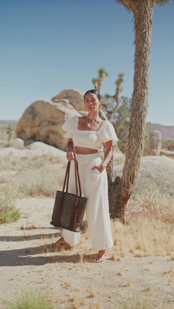 The ultimate tote unites timeless design with our heritage details. Tailor-made beautiful hand-braided comfortable handles that slip easily over the shoulder or arm.  It is roomy yet not bulky. Many interior dividers to help you stay organized.