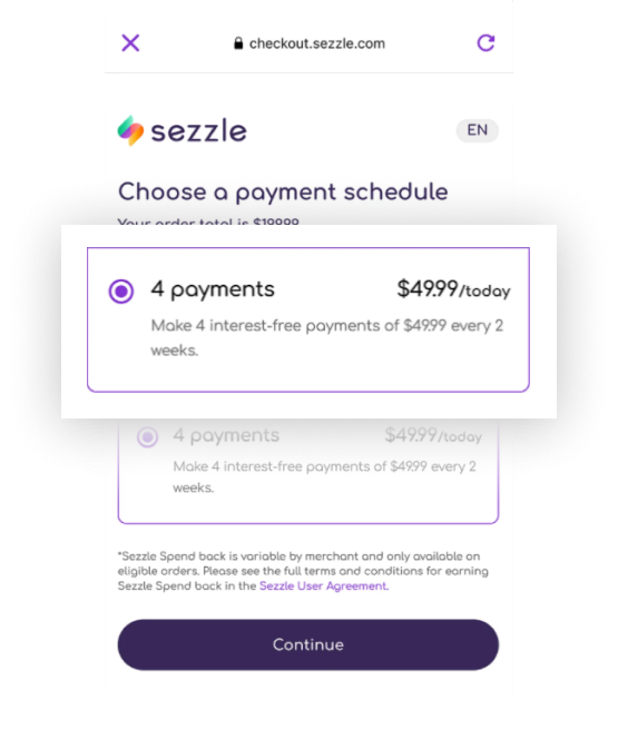 Sezzle's program is designed to let you pay for your purchase over 4 payments. At the time of purchase, 25% is required at the time of the transaction. The remaining 75% balance will be spread in 3 easy payments.