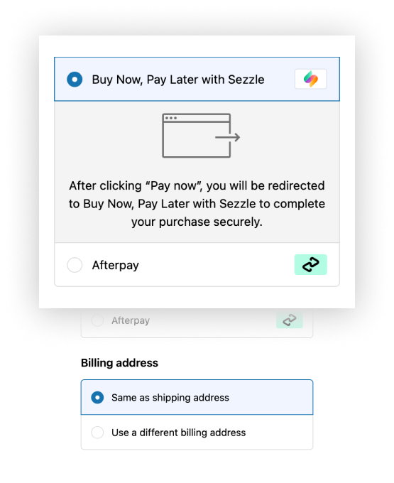 We’ve teamed up with Sezzle and Afterpay to offer more ways to pay over time. Enjoy 0% interest on select payment plans.