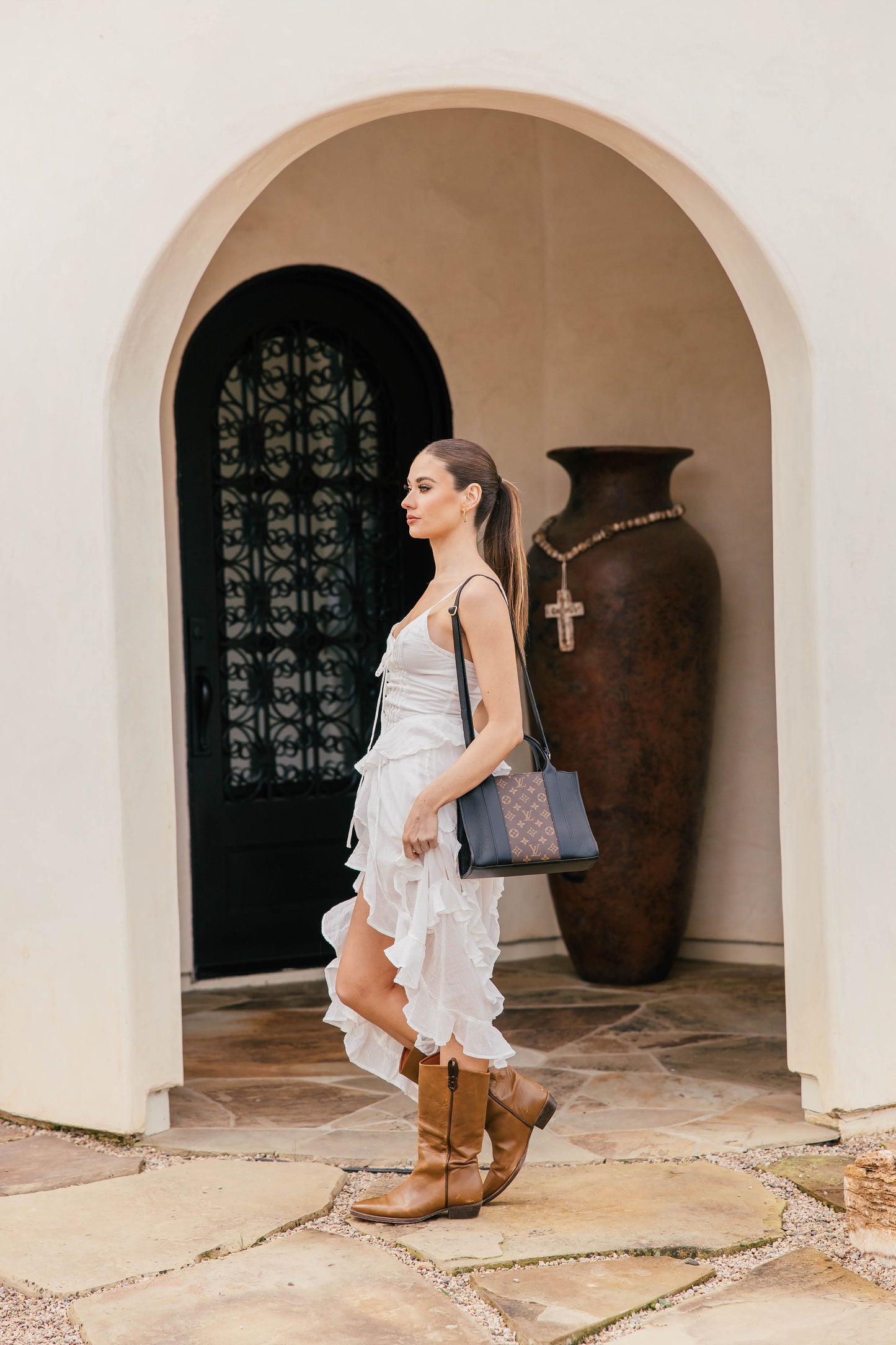 The Birdie is one of our newest bags in our Collection. A perfect size to fit all your essentials it has snaps on each side to keep everything secure it has the perfect size pocket to keep you organized. This bag is made in house and made out of our leather hide and has 100% authentic upcycled Louis Vuitton monogram material on the front and back of it. Comes with an adjustable detachable cross body strap.