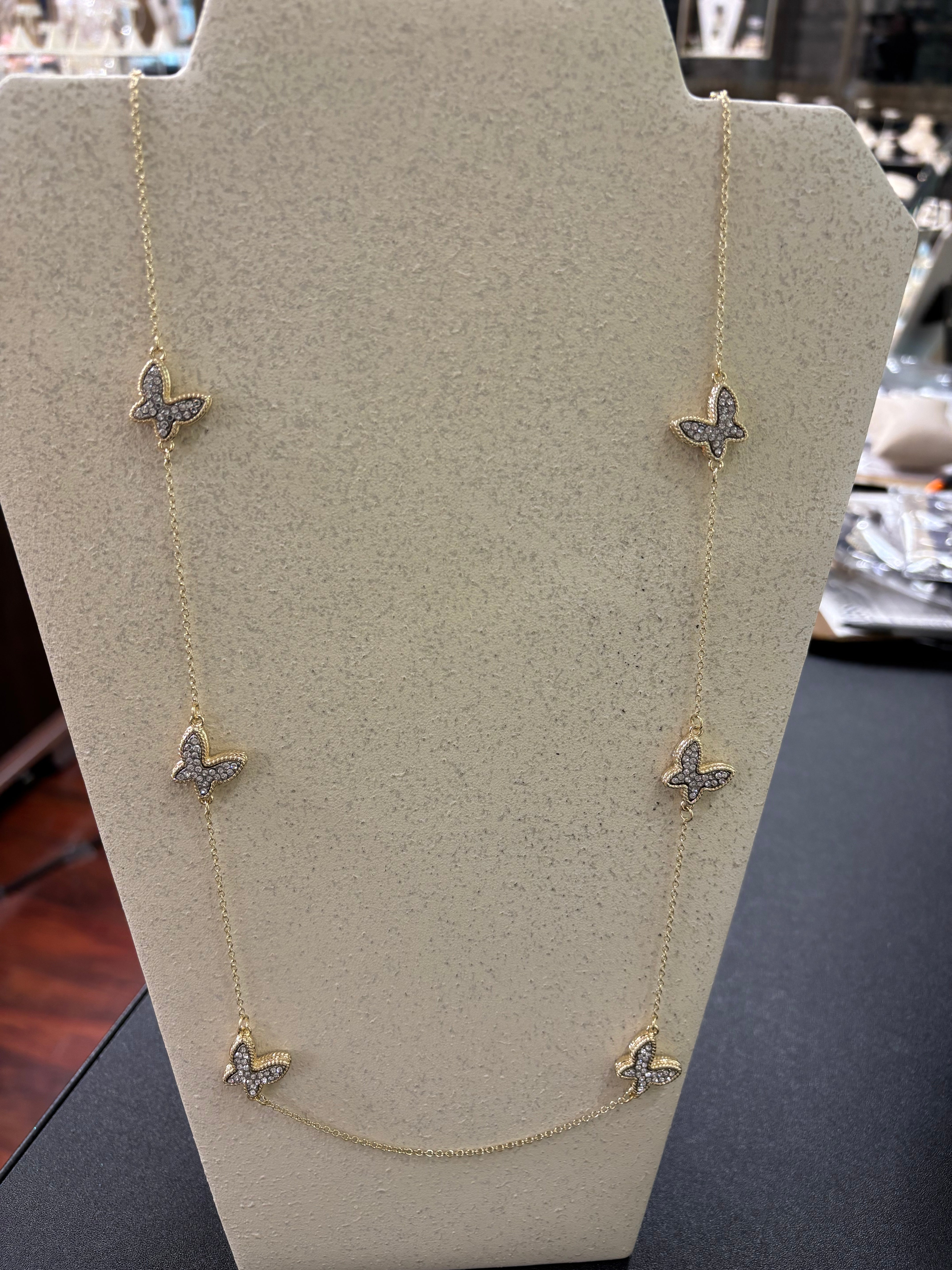 Elevate your style with this stunning 36-inch butterfly necklace, featuring six delicately crafted butterfly pendants along a 14k gold-plated chain. Each butterfly is adorned with sparkling pavé inlay, symbolizing transformation and grace. The extended length makes it perfect for layering or wearing solo for a statement look. With its elegant design and timeless charm, this necklace effortlessly transitions from day to night, adding a touch of whimsy and sophistication to any outfit.