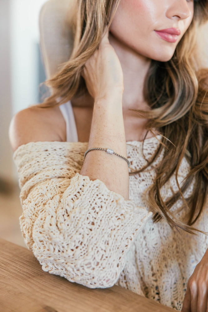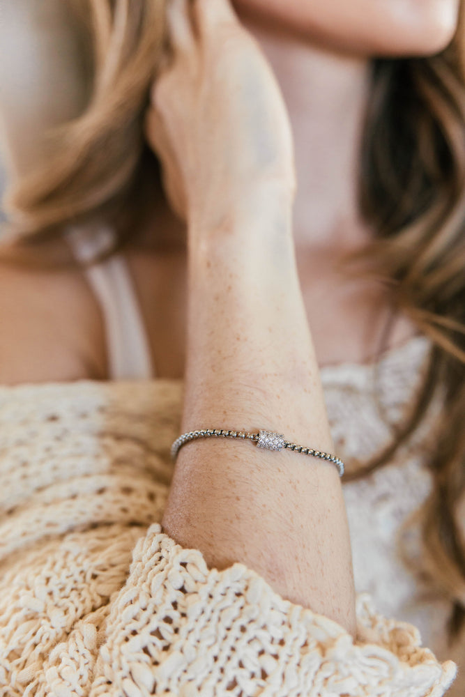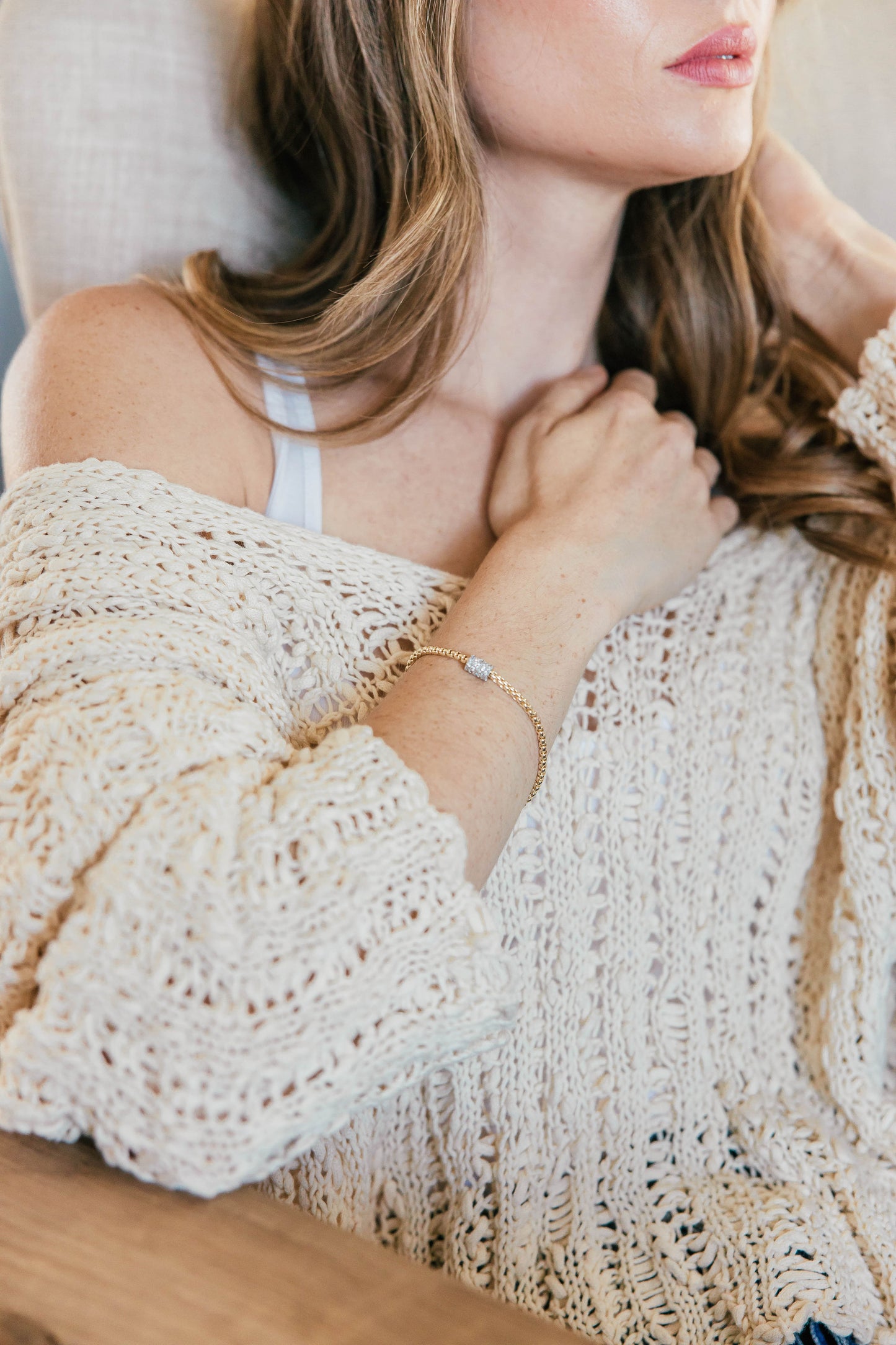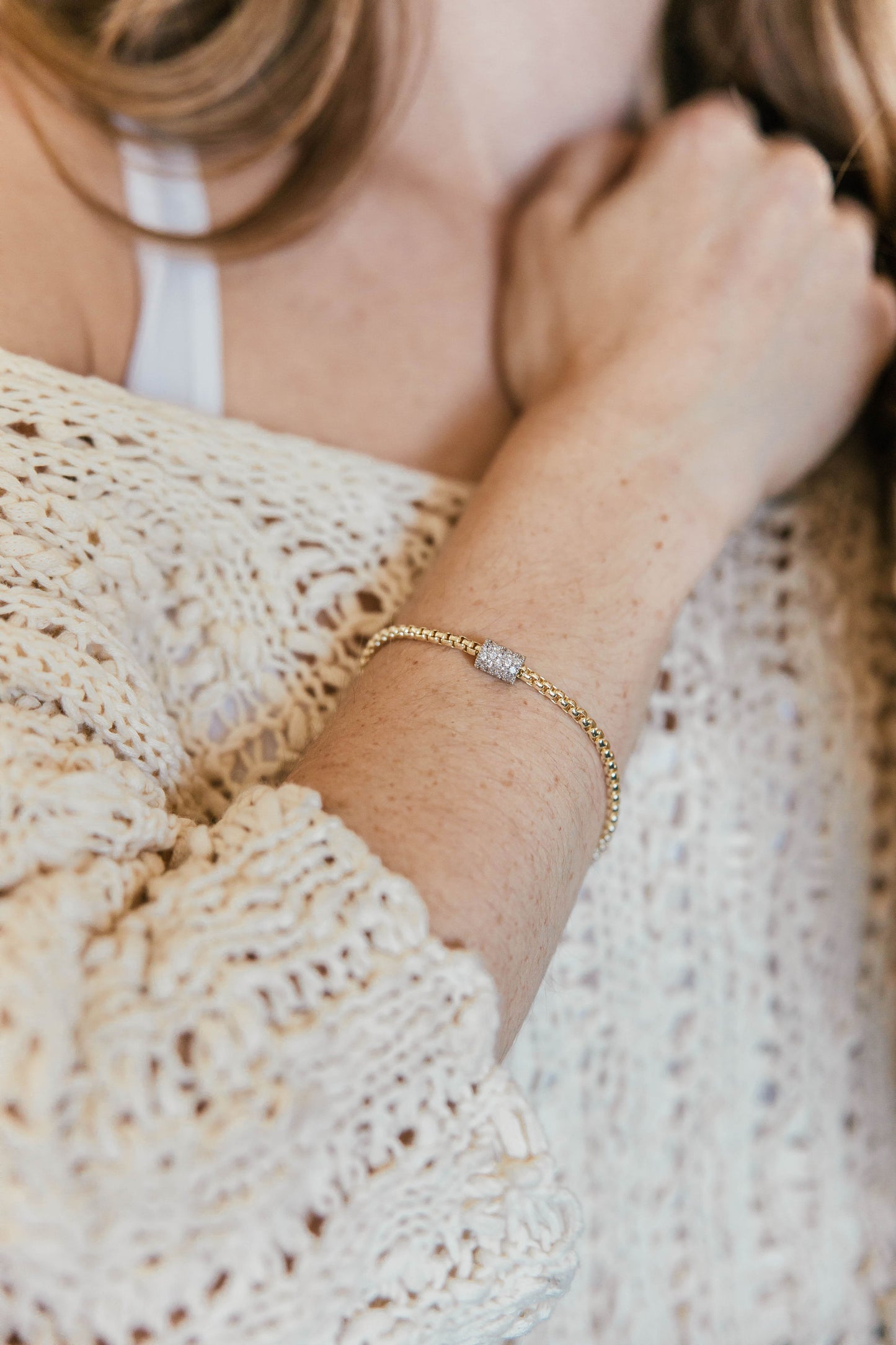This elegant 17" bracelet features a delicate 14k gold-plated chain with a Pave barrel adding a touch of sparkle to the minimalist design. Perfect for both casual wear and formal occasions, this piece offers a timeless charm that enhances any outfit.