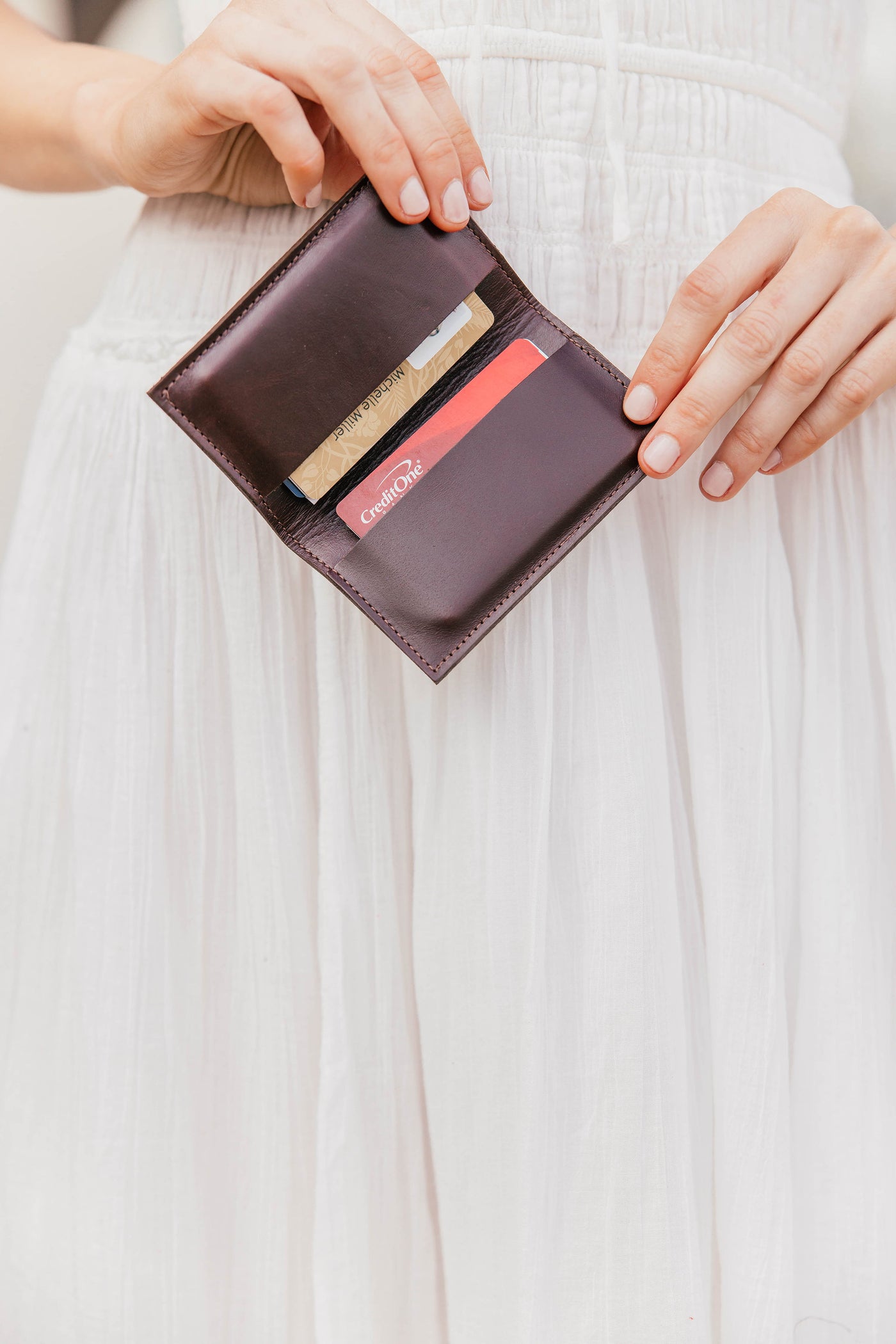 Great for storing credit cards, business cards, and a little bit of cash for on-the-go. Made in house