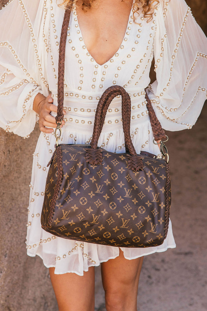 This iconic bag has an unmistakable shape and unites timeless design with our heritage details while being lightweight and very roomy. Tailor-made and hand-braided natural cowhide trim and rolled comfortable handles slip easily over the arm, with a detachable shoulder or cross body strap for the epitome of a classic made Boho-chic and more comfortable.