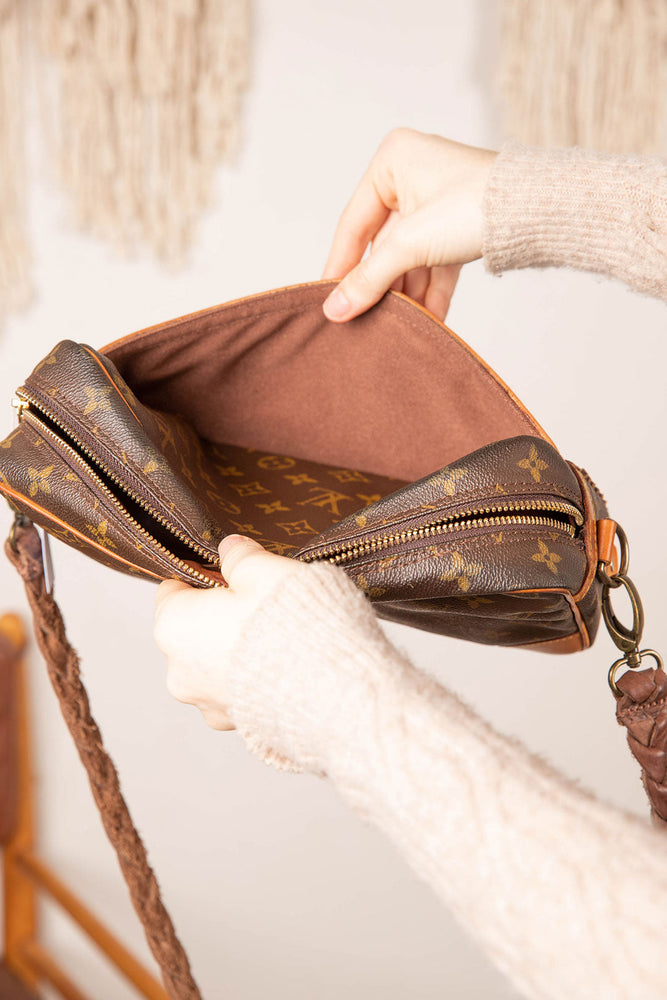 This is an authentic Louis Vuitton bag measuring 11 x 7 x 2 inches. Very stylish and great for day or night wear. Big enough to fit a cellphone, small wallet and your favorite tube of lipstick. All bags are authenticated, lovingly cleaned, restored and enhanced with our beautiful leather braiding by hand here in the United States!