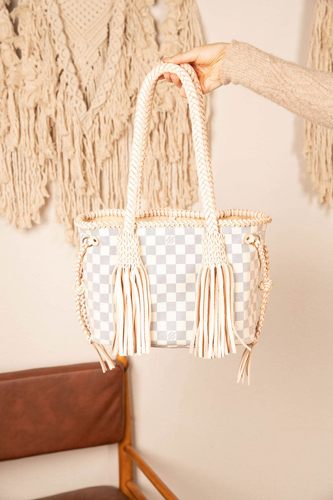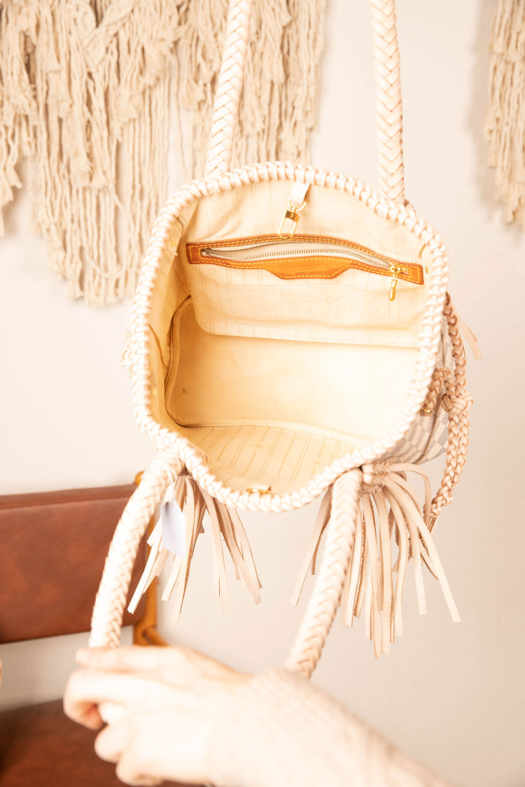 This is an authentic Louis Vuitton bag, measuring 11 x 8 x 5 this bag is great to have it carries just the right amount of things for a day of running errands etc. This bag is a bit smaller as it is the PM of the neverfull collection but with our added features it is the most compact tote. All bags are authenticated, lovingly cleaned, restored and enhanced with our beautiful leather fringe and/or braiding by hand here in the United States!