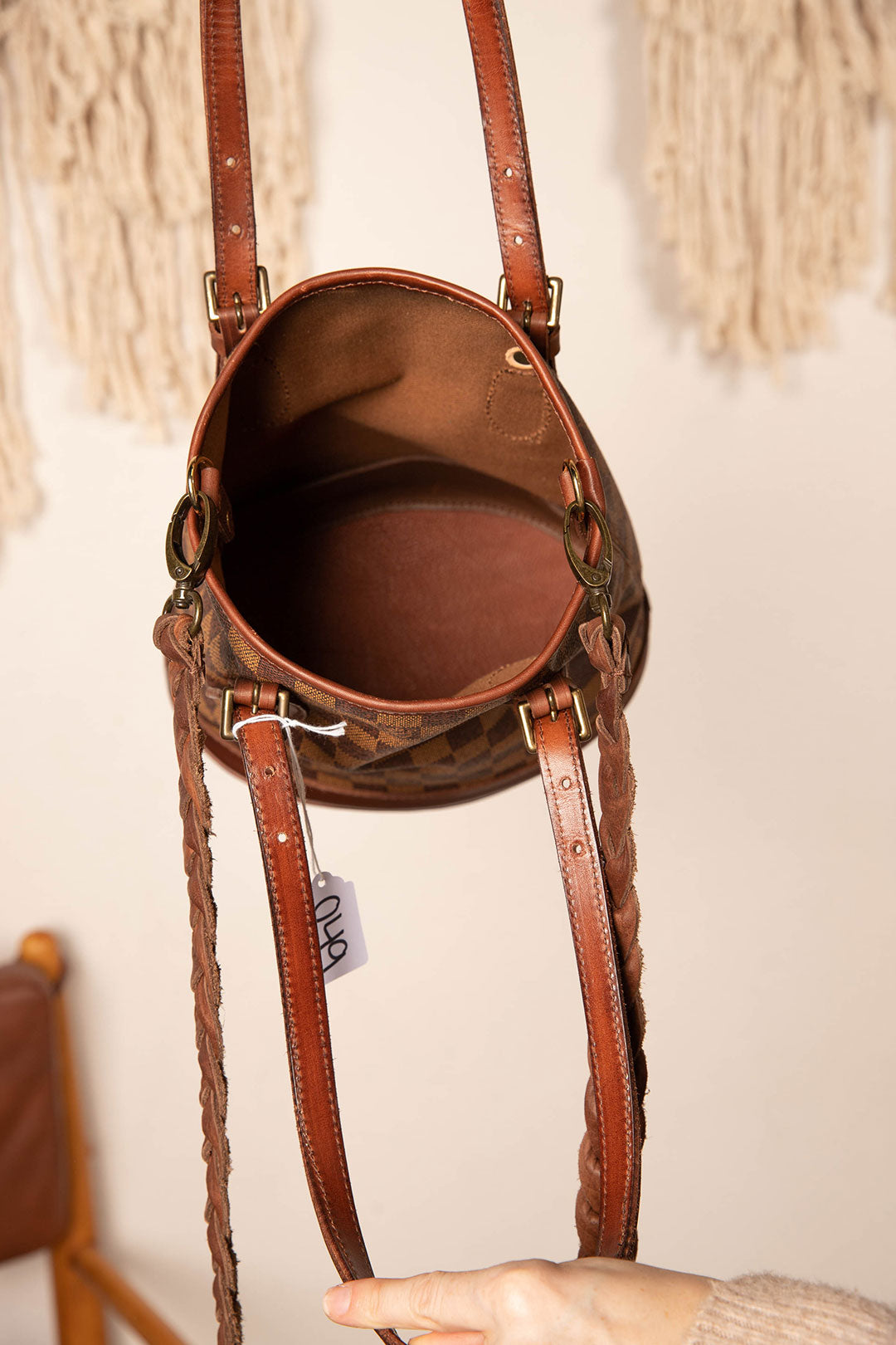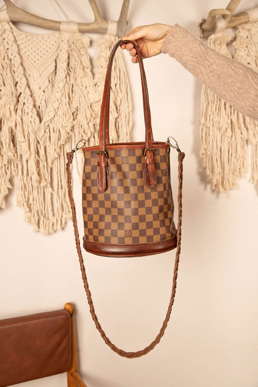 This is an authentic Louis Vuitton Monogram Bucket MM bag. Extremely roomy interior to allow you to carry all your essentials plus more, measuring 9.5 x 10.25 x 6.5 inches. All the leather trims, the inside bottom of the bag and adjustable strap were replaced with premium leather. All bags are authenticated, lovingly cleaned, restored and enhanced with our beautiful leather braided straps by hand here in the United States!