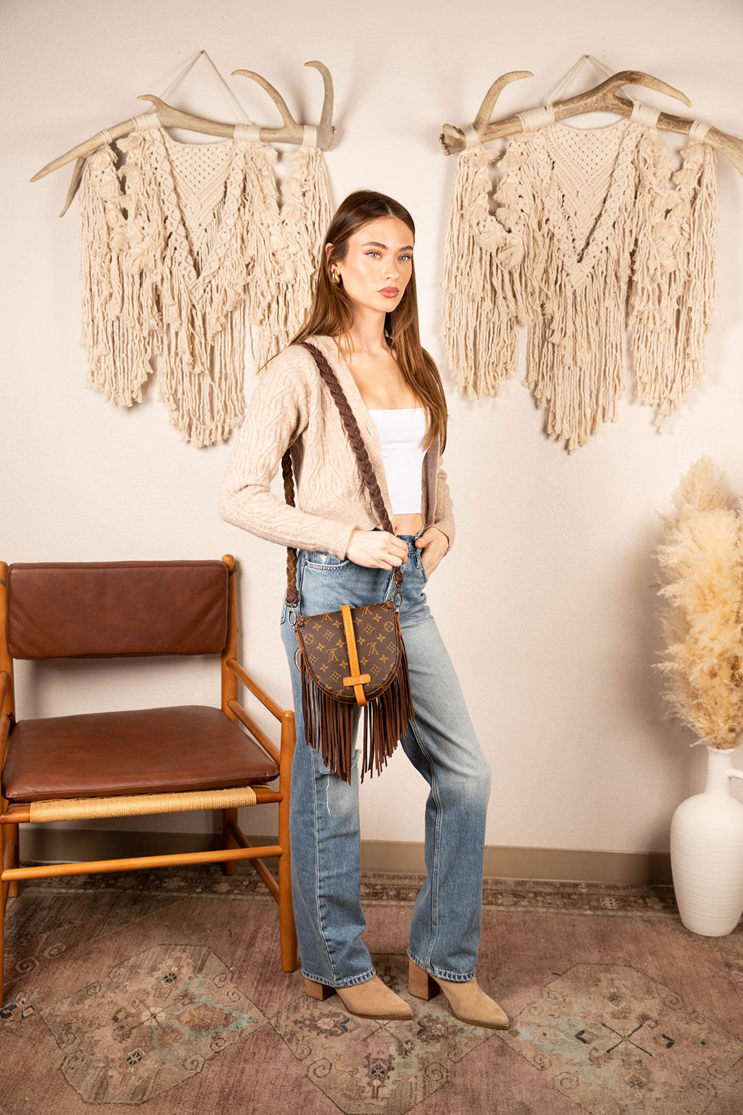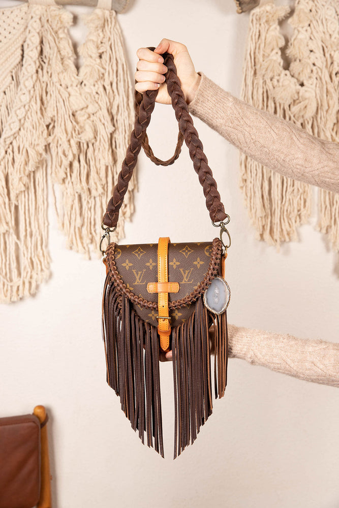 This is an authentic Iconic Louis Vuitton bag, measuring 7.75 x 7 x 2 inches cross body bag with front buckle closure. It is distinctly shaped with a spacious inside to carry all basic essentials. All bags are authenticated, lovingly cleaned, restored and enhanced with our beautiful leather fringe and/or braiding by hand here in the United States!
