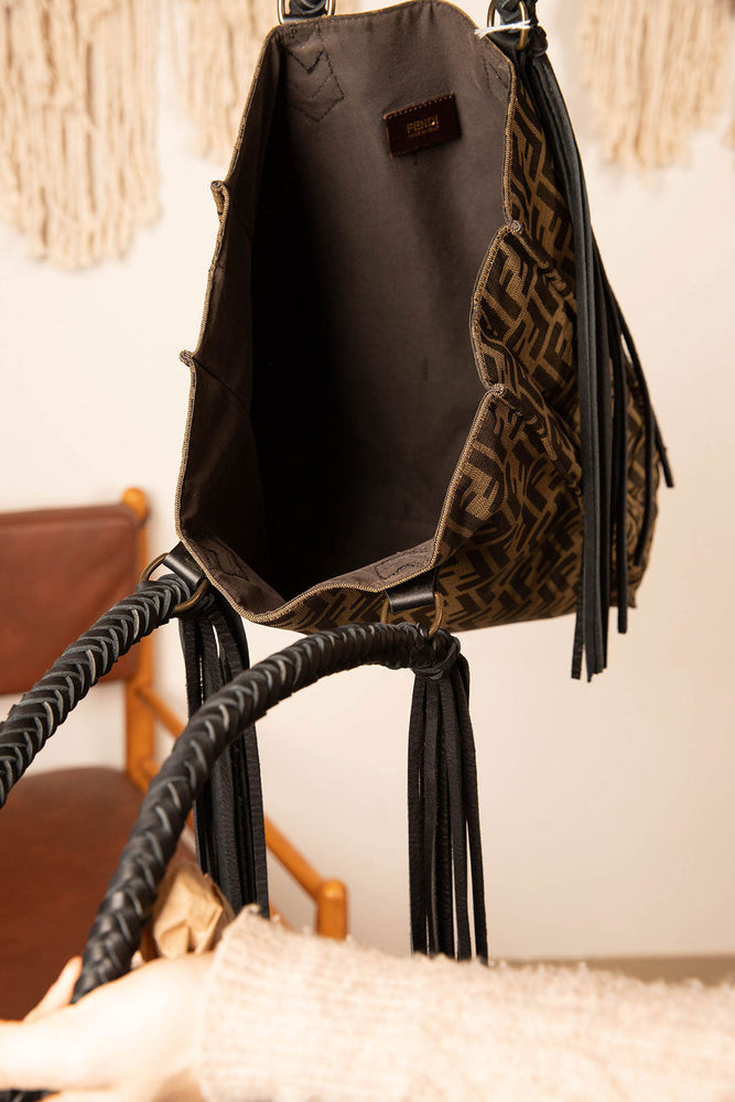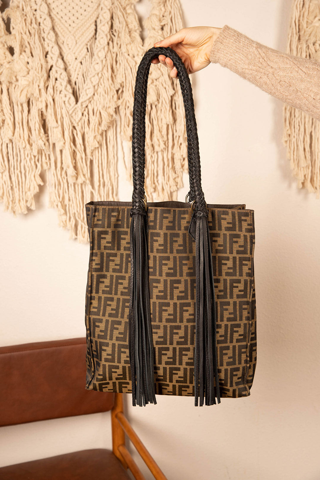 This is an authentic FENDI bag. This is a great everyday bag and also works well for the office. This is a big bag but not bulky, measuring 15 x 14 x 3.5 and will fit a full-size laptop and all your essentials. The interior of the bag is suede/cloth with 2 pockets. All bags are authenticated, lovingly cleaned, restored and enhanced with our beautiful premium leather handles here in the United States!