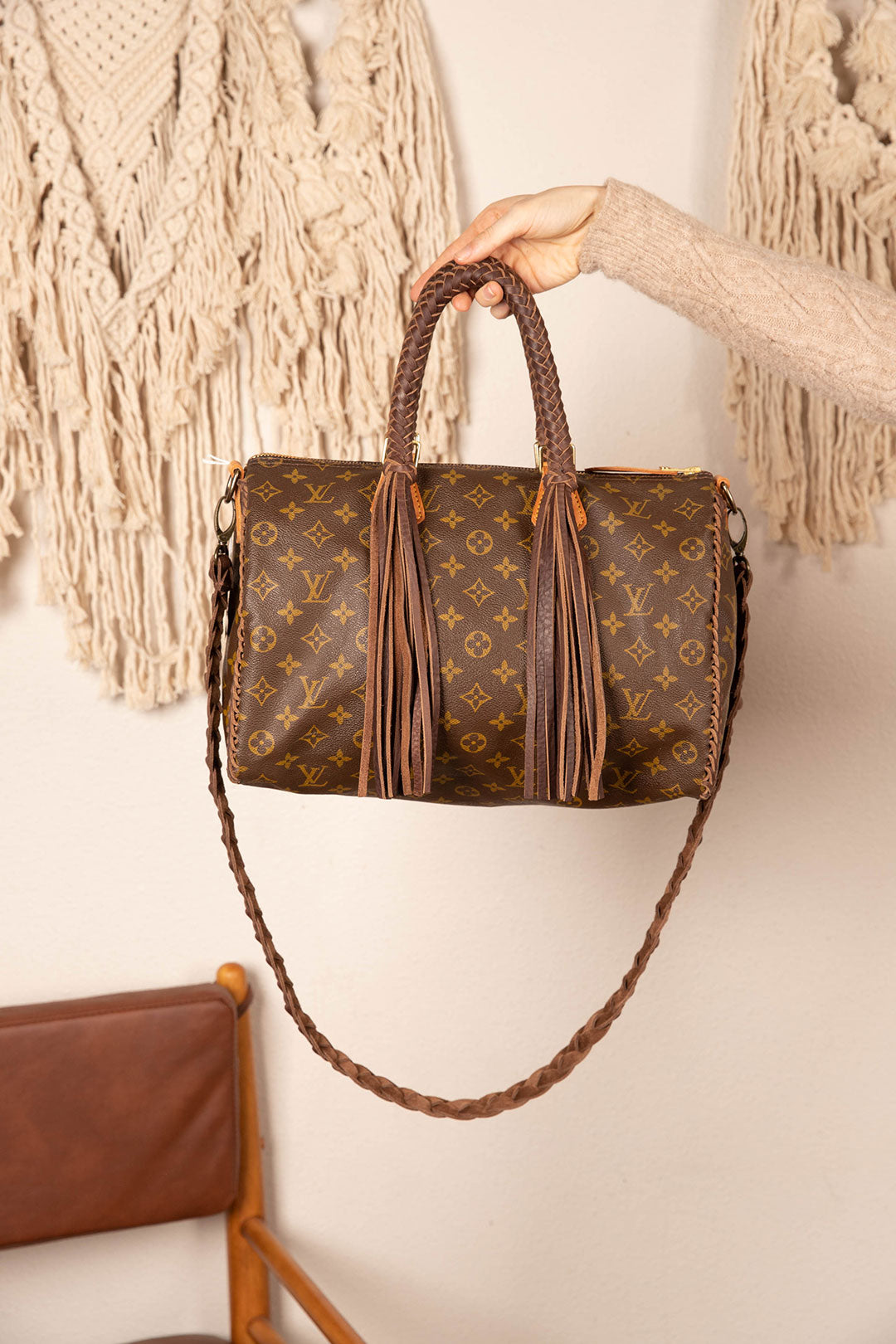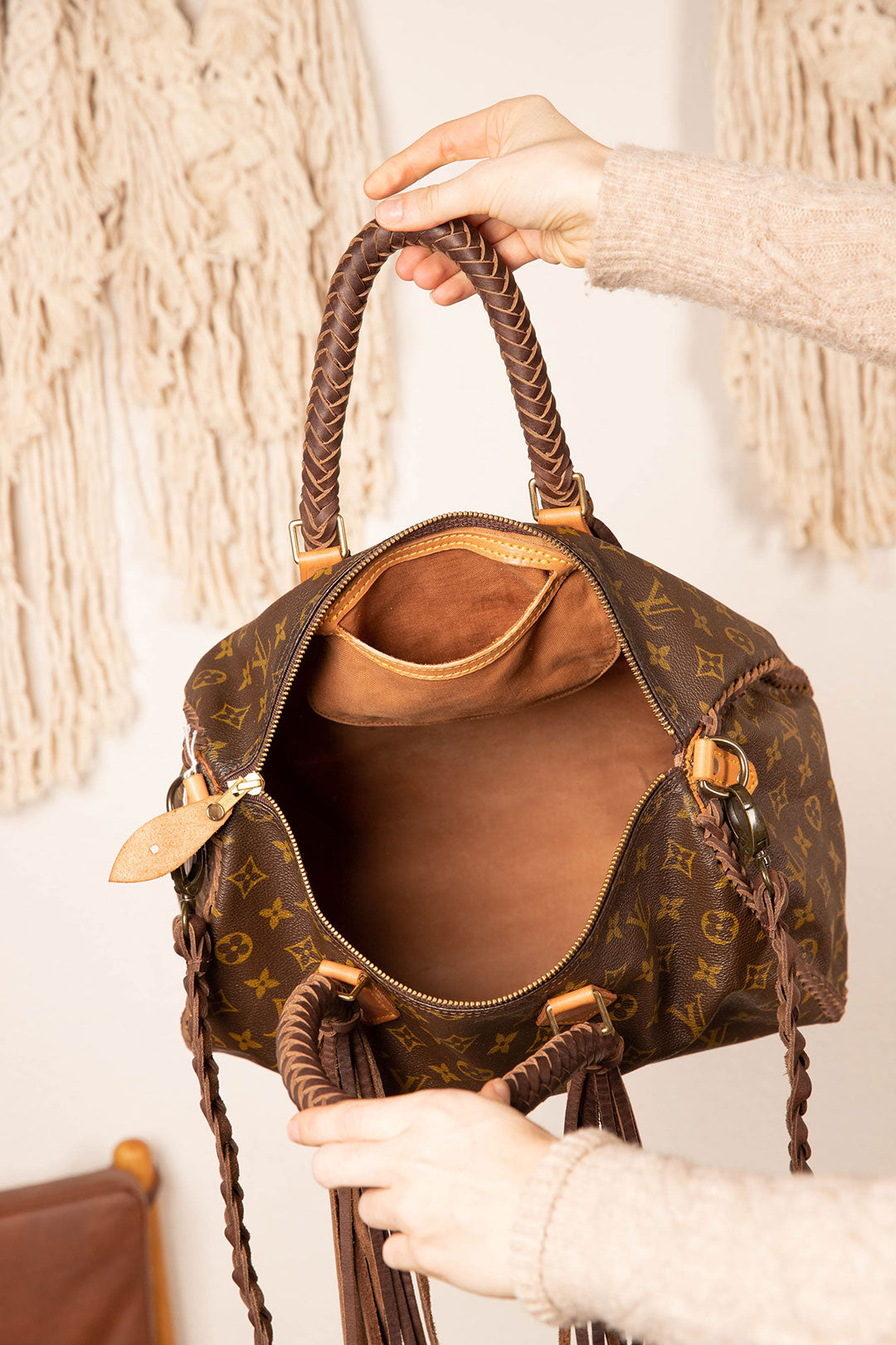This is an authentic Iconic Louis Vuitton bag. It is an elegant compact bag that is extremely roomy inside with 1 zippered pocket. If you carry a lot of stuff, this is the perfect bag for you. Measuring 13.8 x 9.1 x 7.1 inches. All bags are authenticated, lovingly cleaned, restored and enhanced with our beautiful leather braided straps by hand here in the United States!