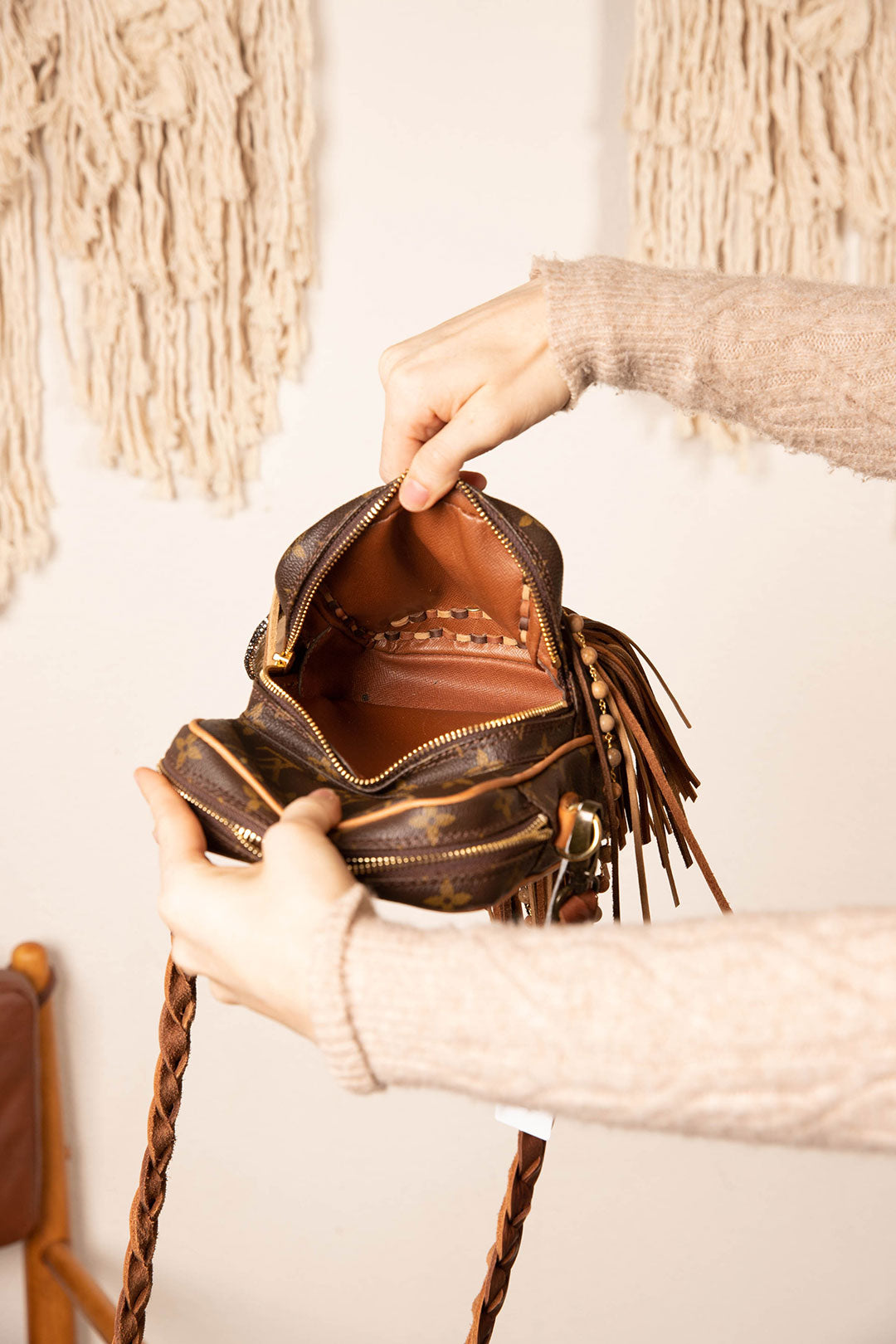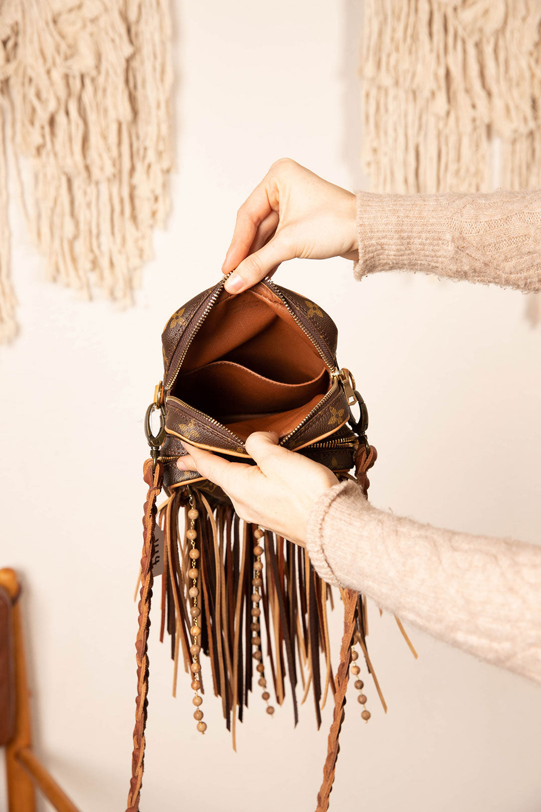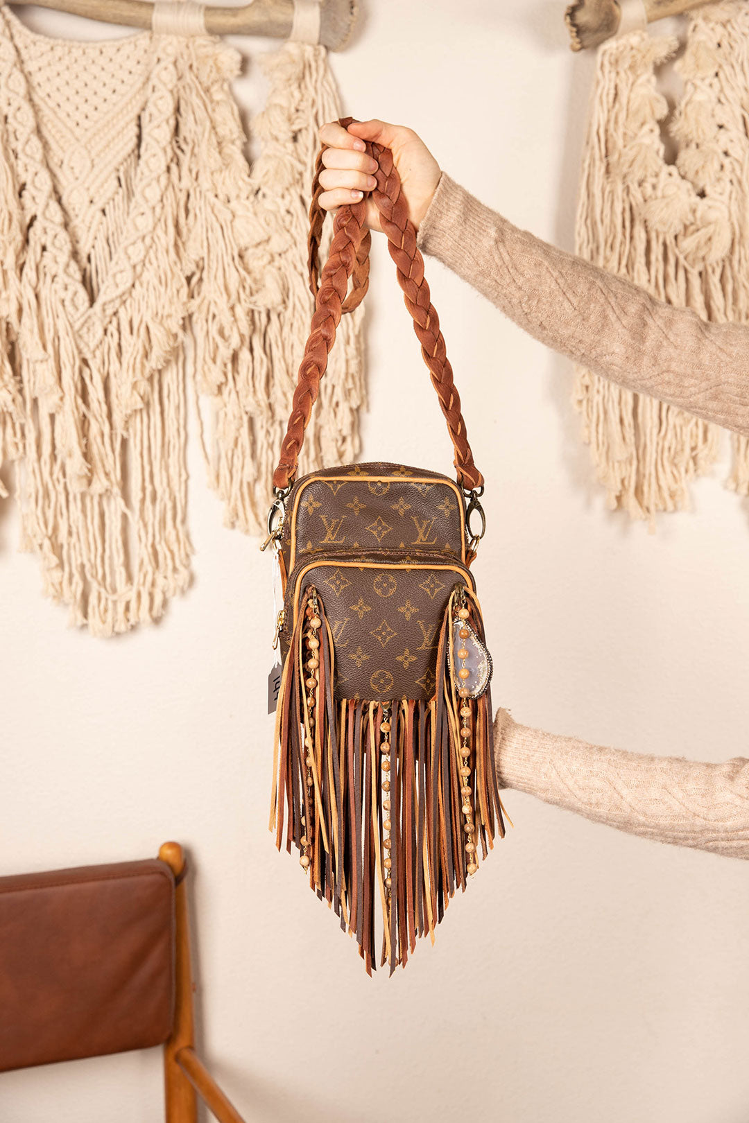 This is an authentic monogram Louis Vuitton crossbody bag, measuring 8 x 6 x 4 inches. It is a two-compartment bag with zippers on the main and front compartment to protect all your essentials. All bags are authenticated, lovingly cleaned, restored and enhanced with our beautiful leather fringe and/or braiding by hand here in the United States!