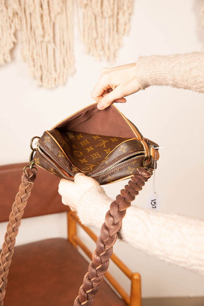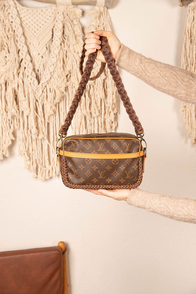 This is an authentic Louis Vuitton bag measuring 11 x 7 x 2 inches. Very stylish and great for day or night wear. Big enough to fit a cellphone, small wallet and your favorite tube of lipstick. All bags are authenticated, lovingly cleaned, restored and enhanced with our beautiful leather braiding by hand here in the United States!