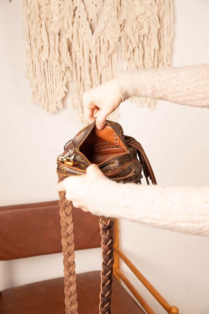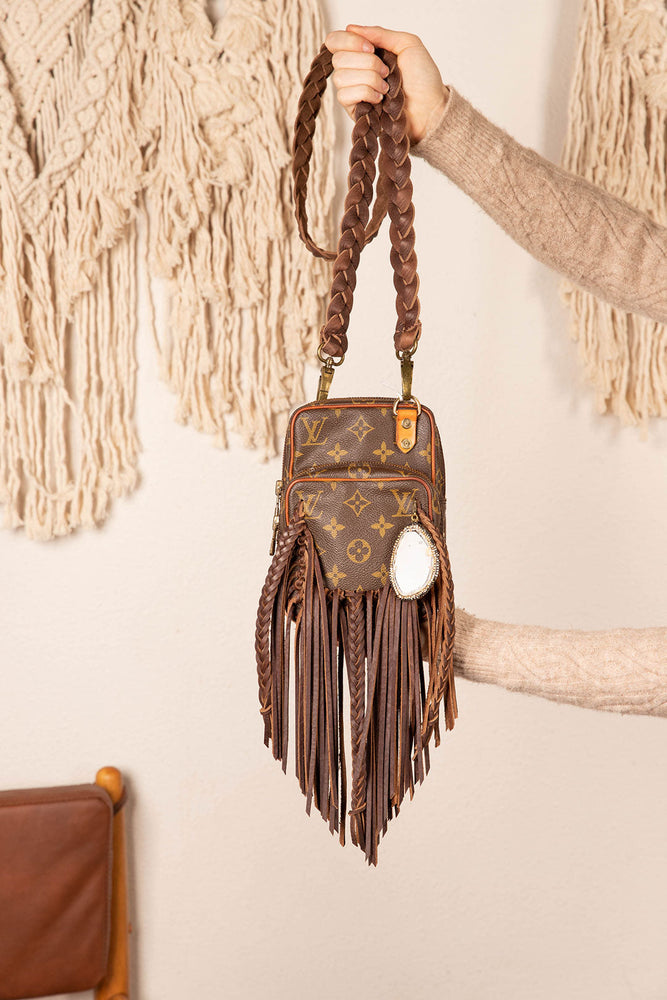 This is an authentic monogram Louis Vuitton bag, measuring 5 x 7 x 4 inches. It is a two-compartment bag with zippers on the main and front compartment to protect all your essentials. All bags are authenticated, lovingly cleaned, restored and enhanced with our beautiful leather fringe and/or braiding by hand here in the United States!