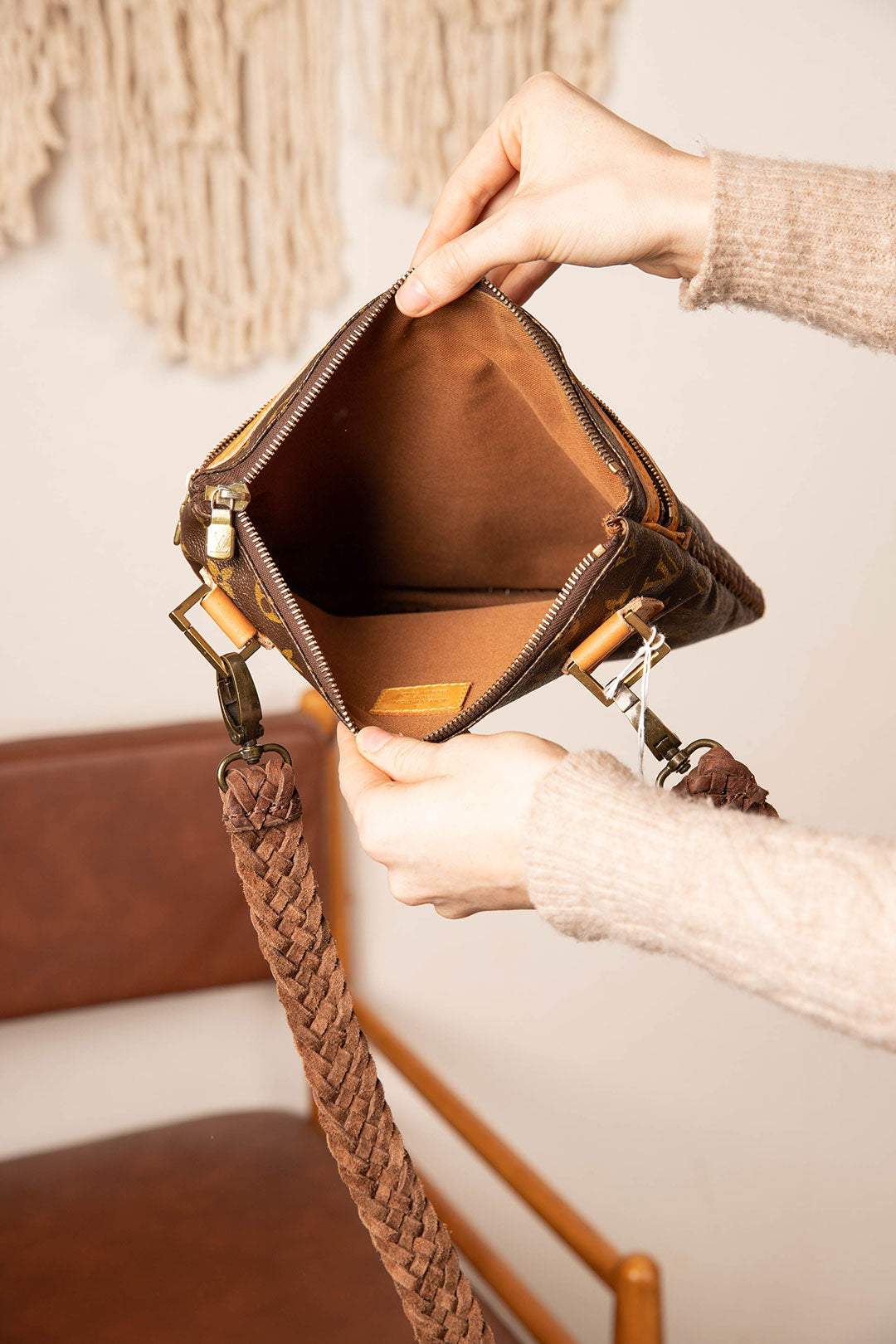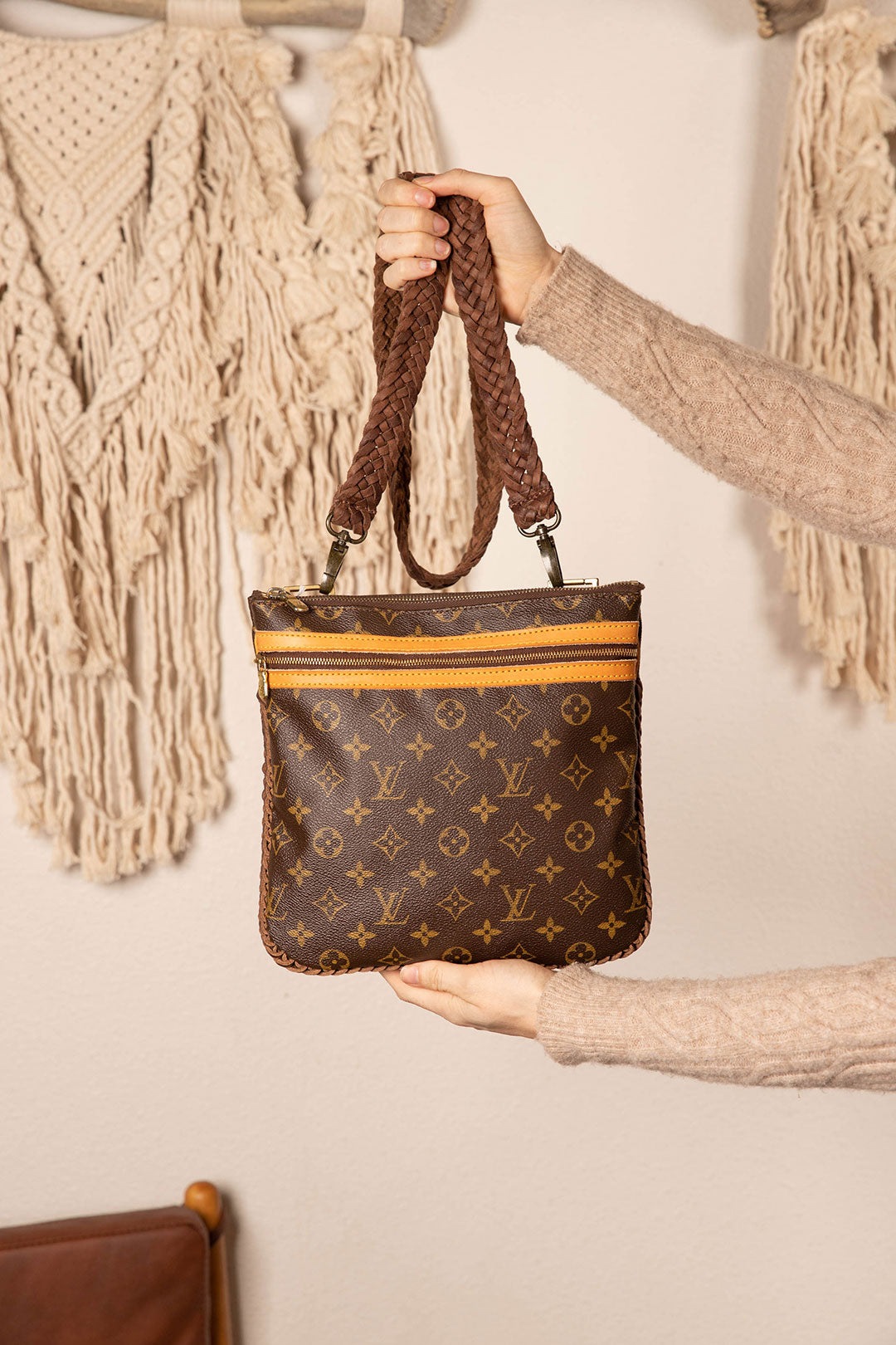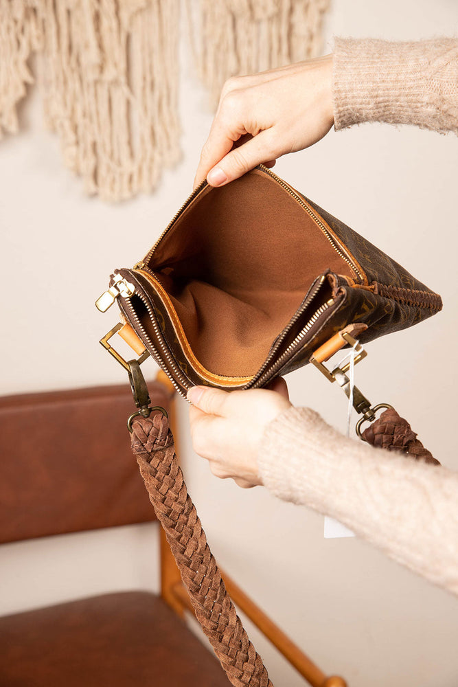 This is an authentic Louis Vuitton bag. This is a great everyday crossbody bag, measuring at 10 x 10 x 2inches. This is a skinny profile bag with a zippered front pocket to secure and hold your daily essentials. All bags are authenticated, lovingly cleaned, restored and enhanced with our beautiful leather fringe and/or braiding by hand here in the United States!