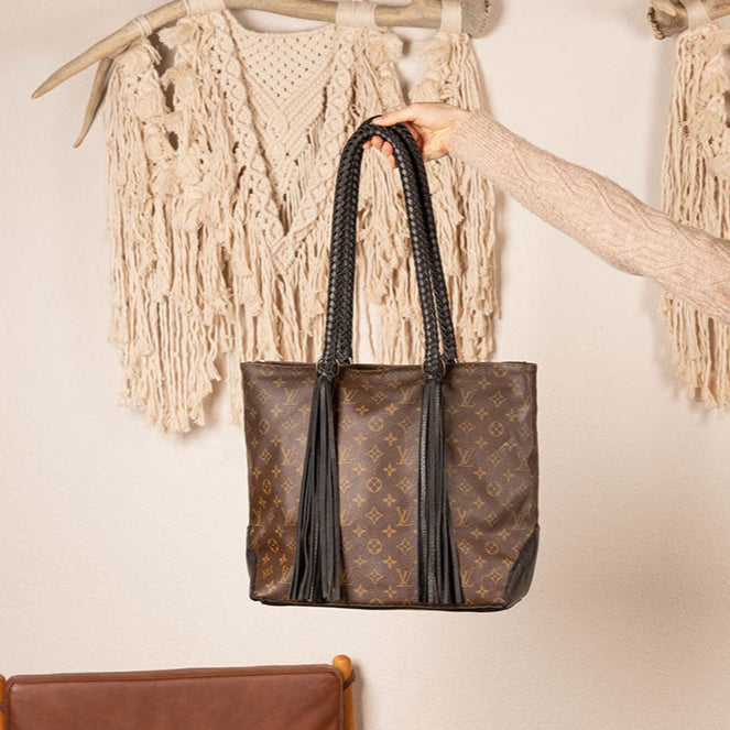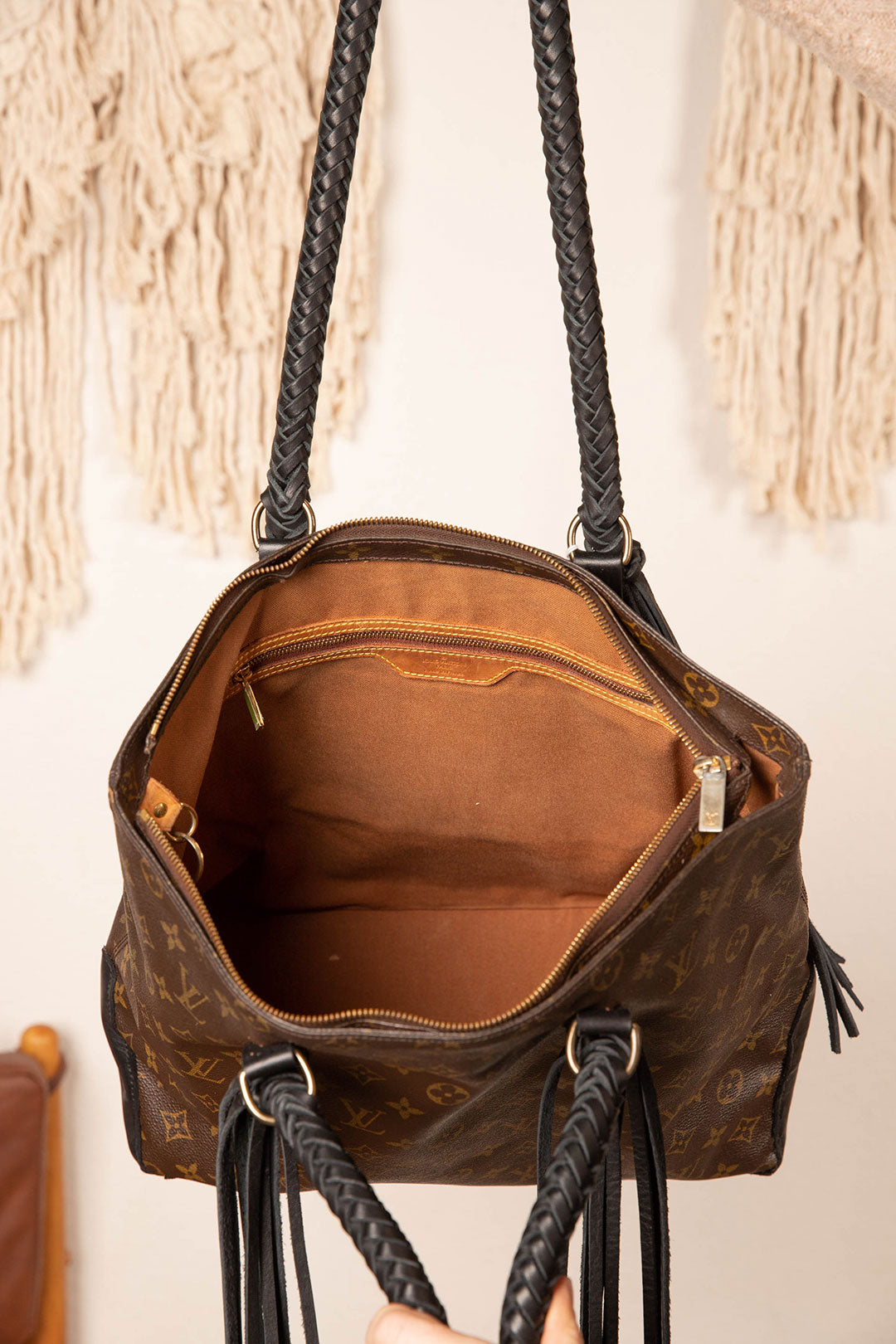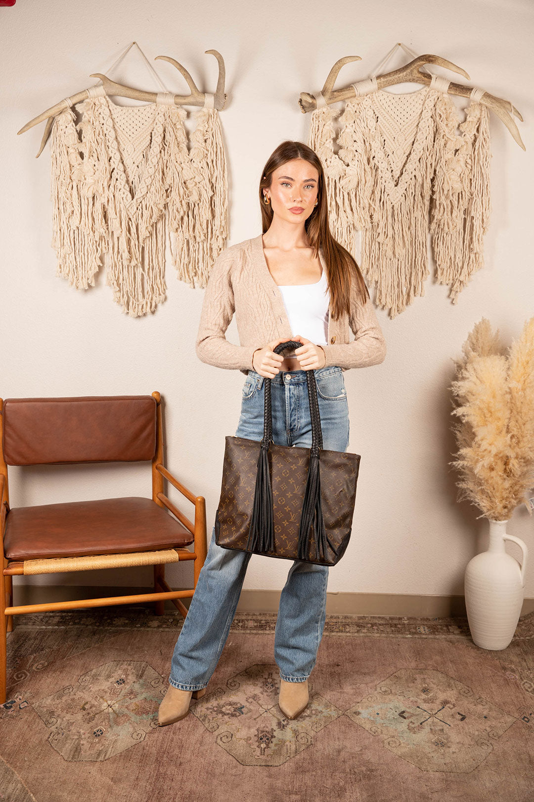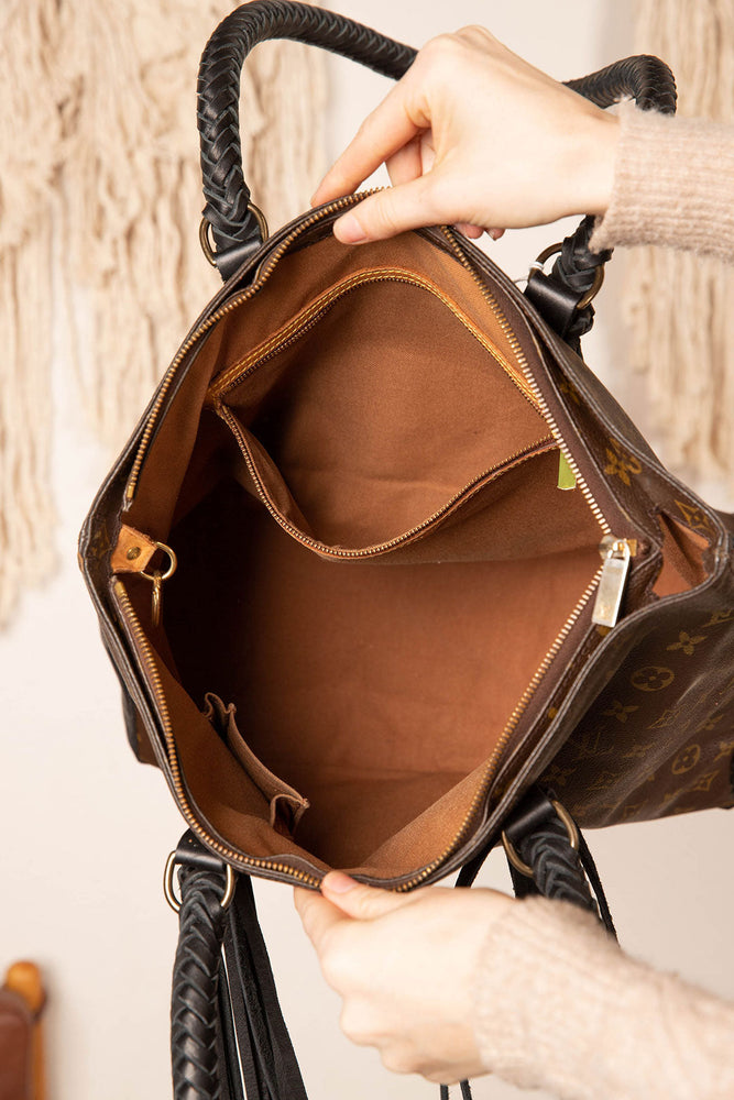 This is an authentic Louis Vuitton tote bag, measuring 16.9 x 13 x 6.3 inches. It has a zippered main compartment with pockets inside the bag. It is very roomy and will fit a laptop and or an iPad with case. All bags are authenticated, lovingly cleaned, restored and enhanced with our beautiful leather braided handles by hand here in the United States!