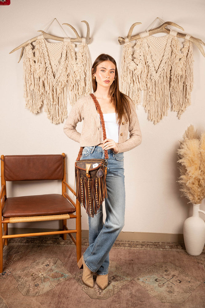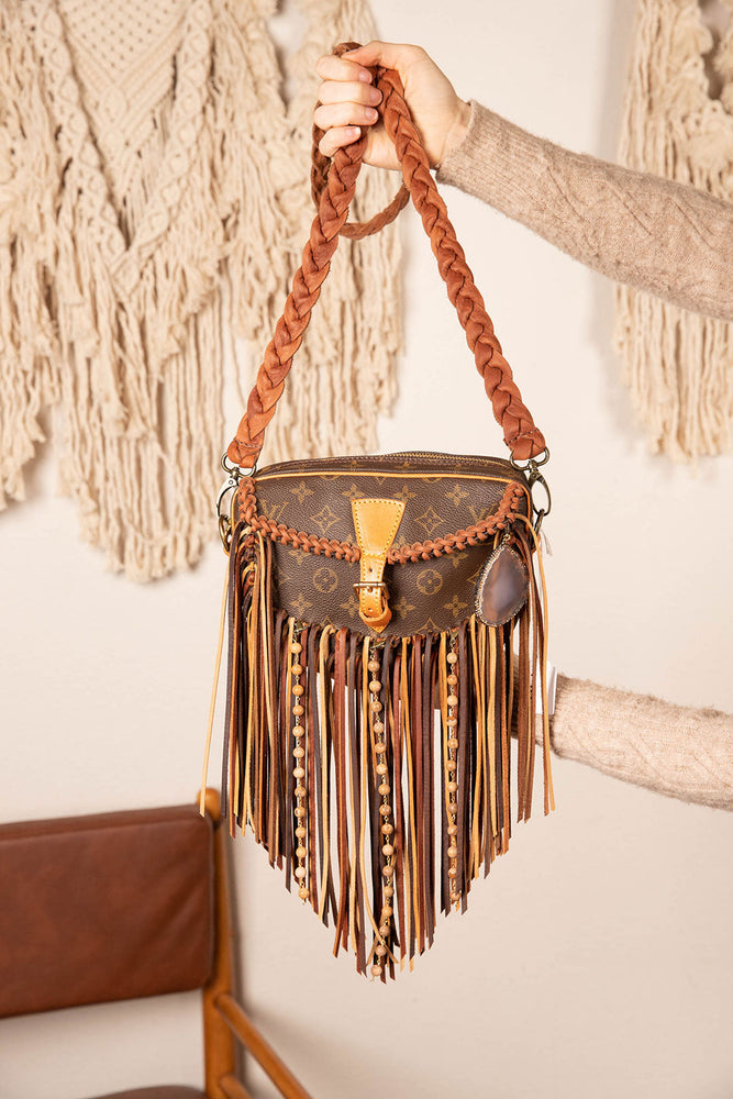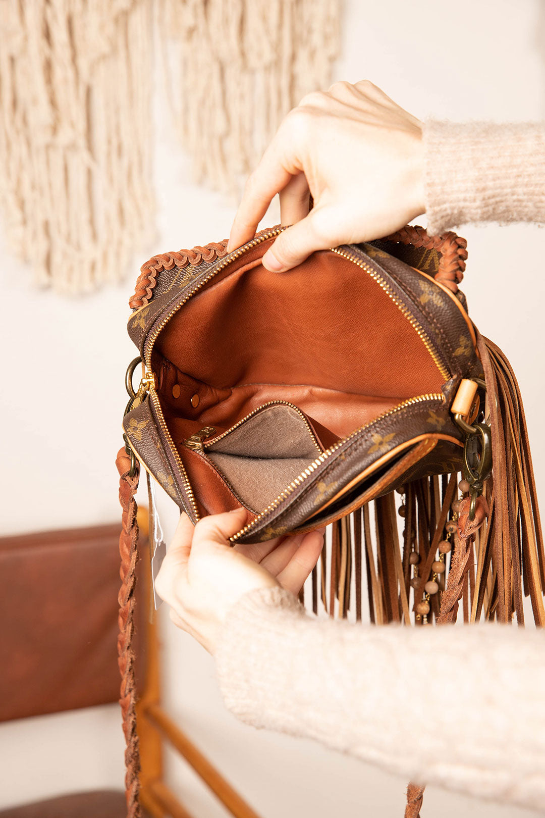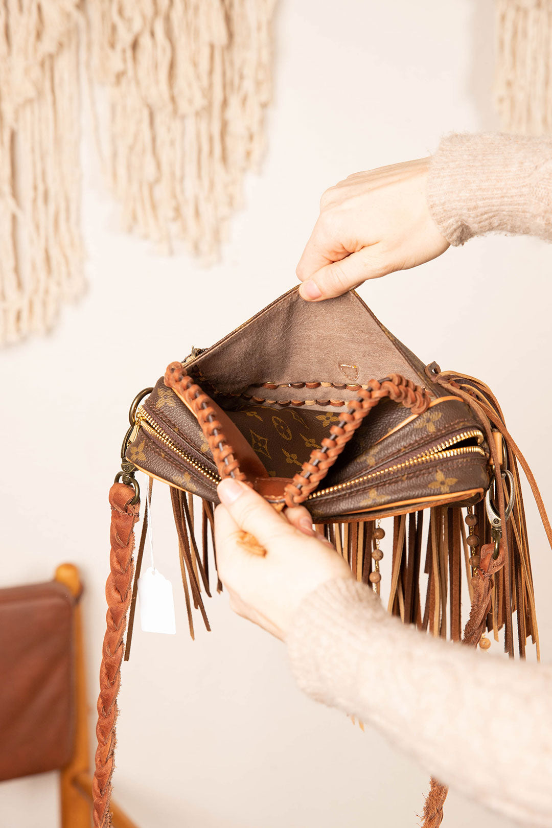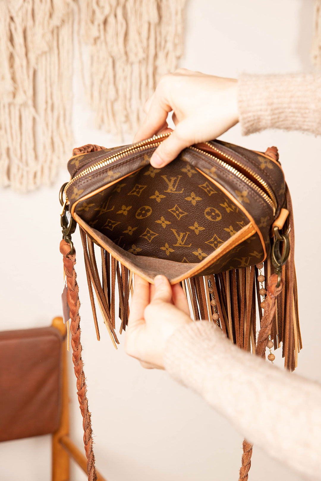 This is an authentic Louis Vuitton cross body bag, measuring 10 x 7.25 x 2. inches. Large bag and will hold all essentials plus more. Zippered main compartment with an open front pocket. All bags are authenticated, lovingly cleaned, restored and enhanced with our beautiful leather fringe and/or braiding by hand here in the United States!