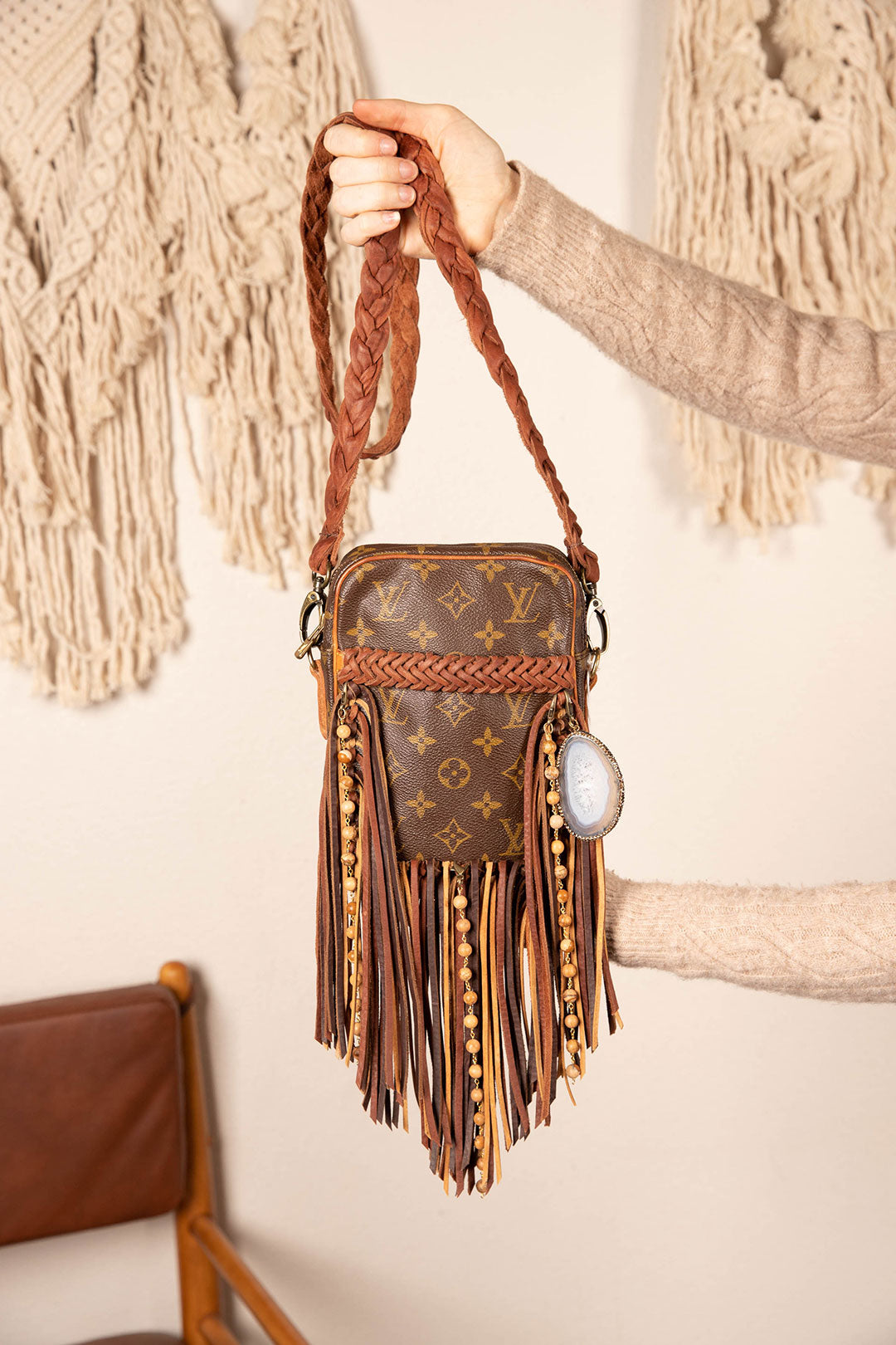 This is an authentic Louis Vuitton cross body bag, measuring 6.25 x 8.5 x 1.75 inches. Small bag but will hold basic essentials. Zippered main compartment with an open front pocket. All bags are authenticated, lovingly cleaned, restored and enhanced with our beautiful leather fringe and/or braiding by hand here in the United States!