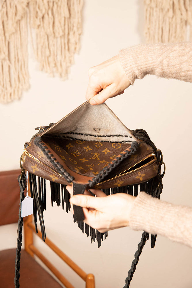 This is an authentic Louis Vuitton cross body bag, measuring 10 x 7.25 x 2. inches. Large bag and will hold all essentials plus more. Zippered main compartment with an open front pocket. All bags are authenticated, lovingly cleaned, restored and enhanced with our beautiful leather fringe and/or braiding by hand here in the United States!