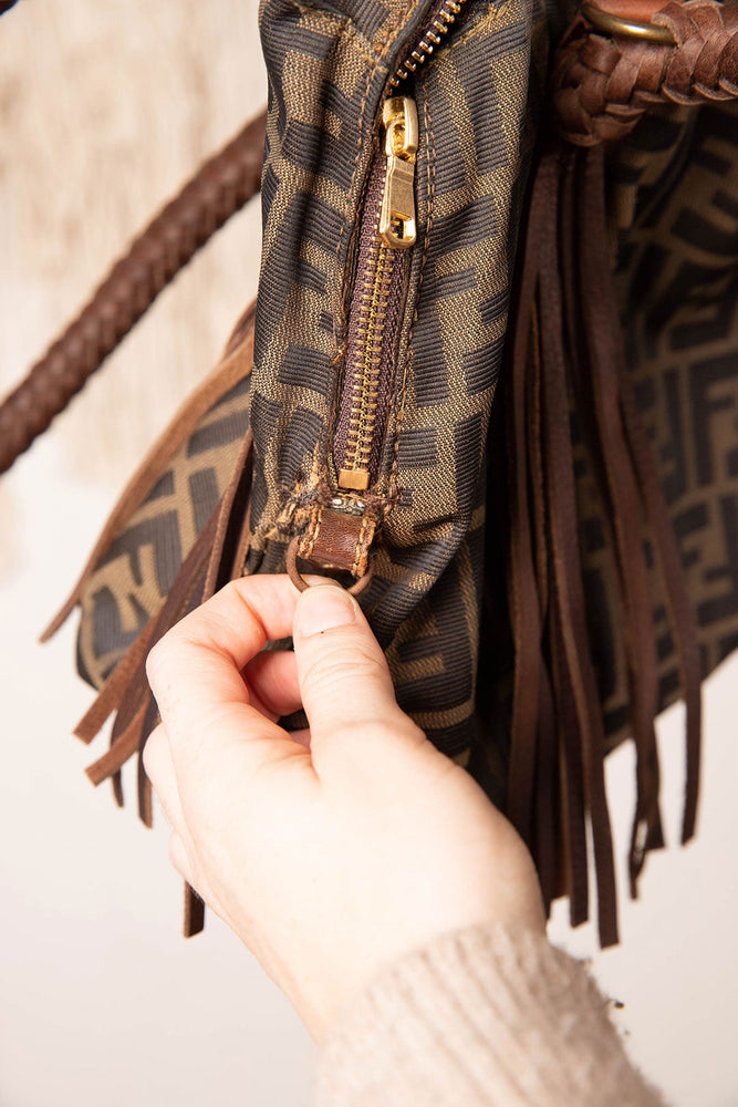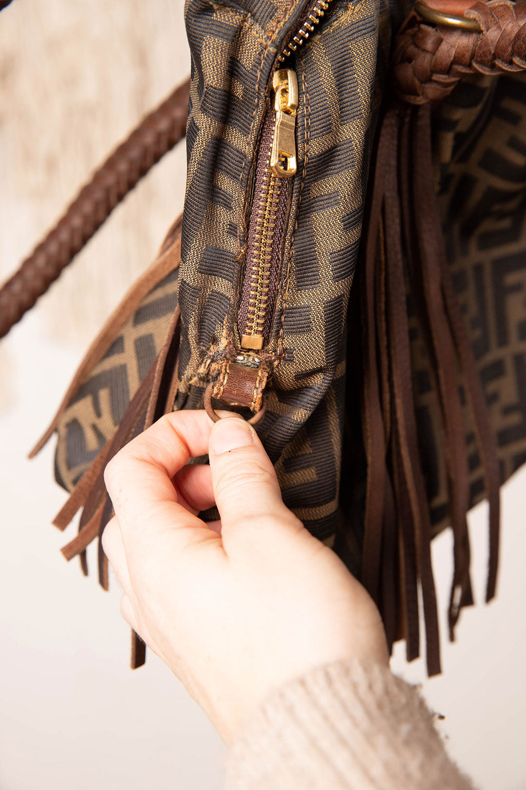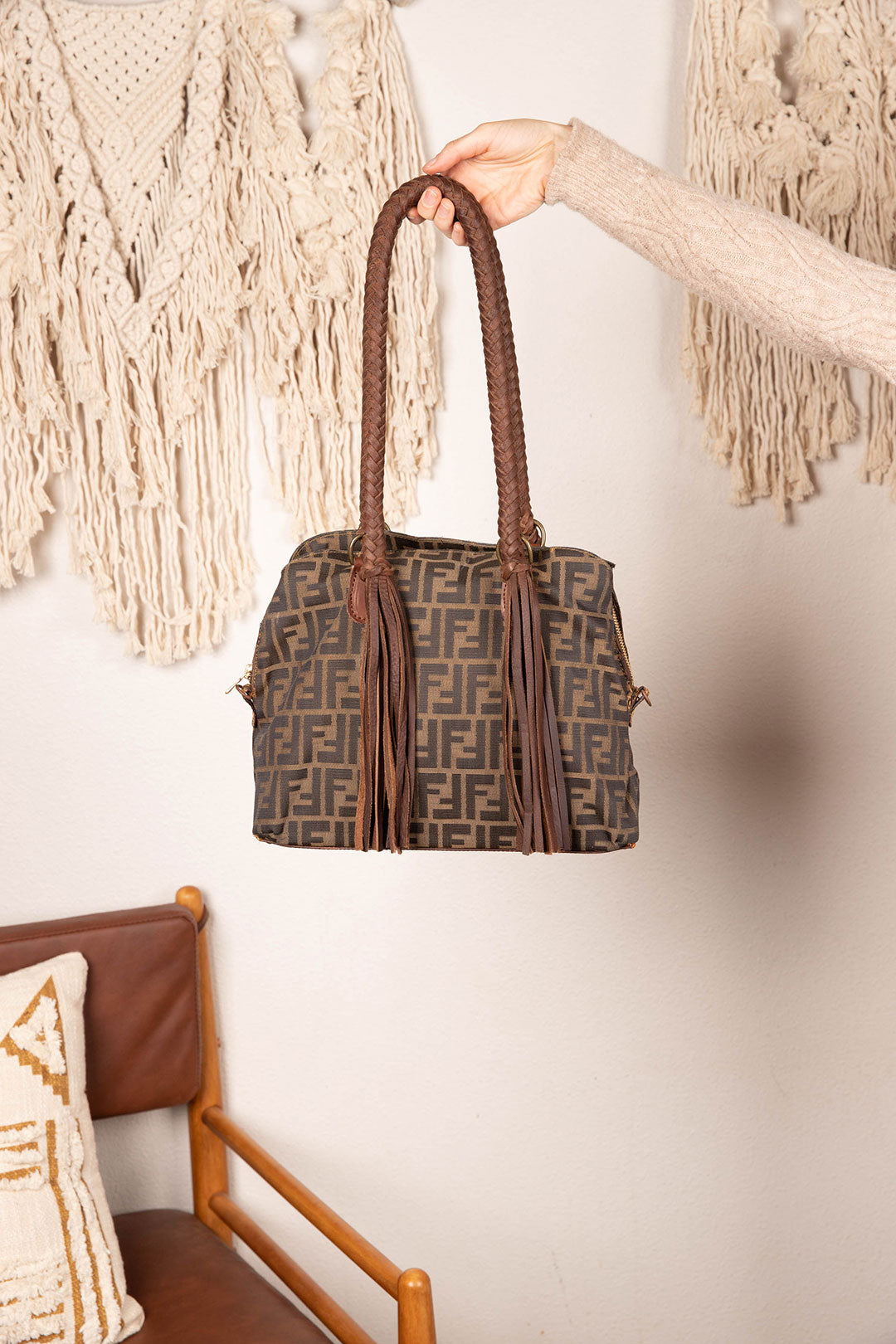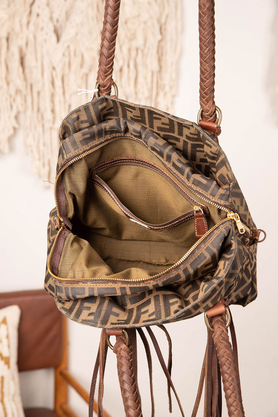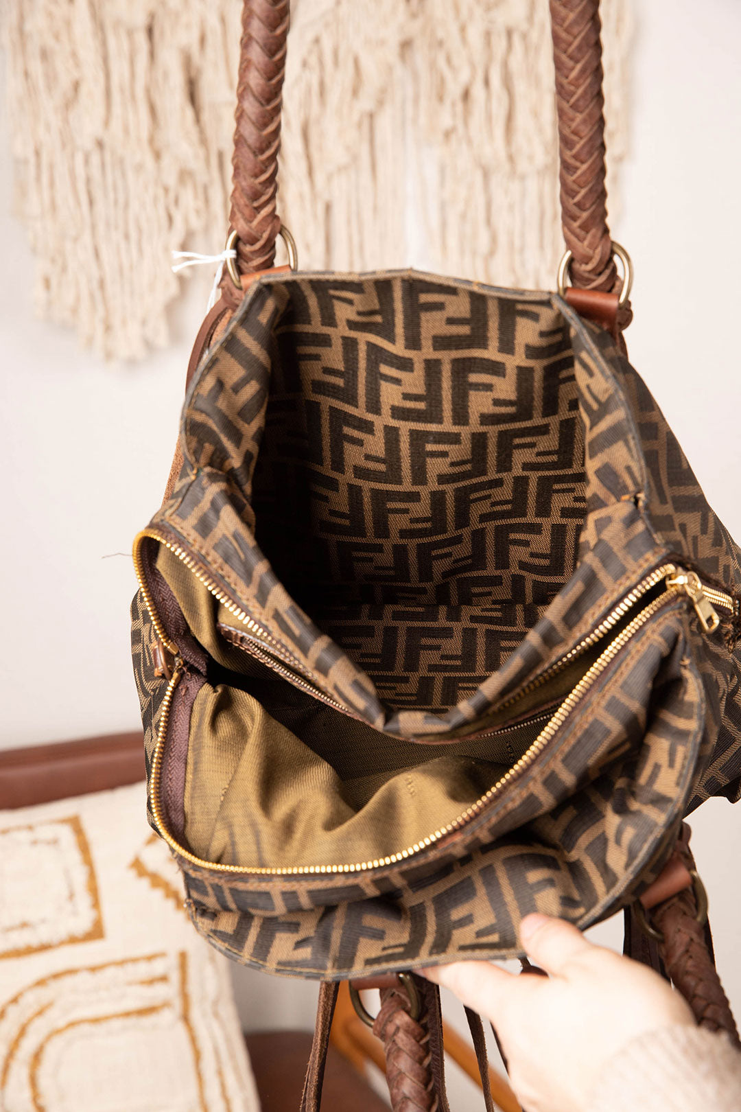 This is an authentic FENDI bag. Great every day bag that is very spacious and will carry all your essentials. It has a zippered wide mouth opening and measures approx. 13.7 x 10.6 x 6.3 inches  inches. The bottom of the bag was replaced with new premium leather to give you many more years of use. All bags are authenticated, lovingly cleaned, restored and enhanced with our beautiful leather braided handles by hand here in the United States!