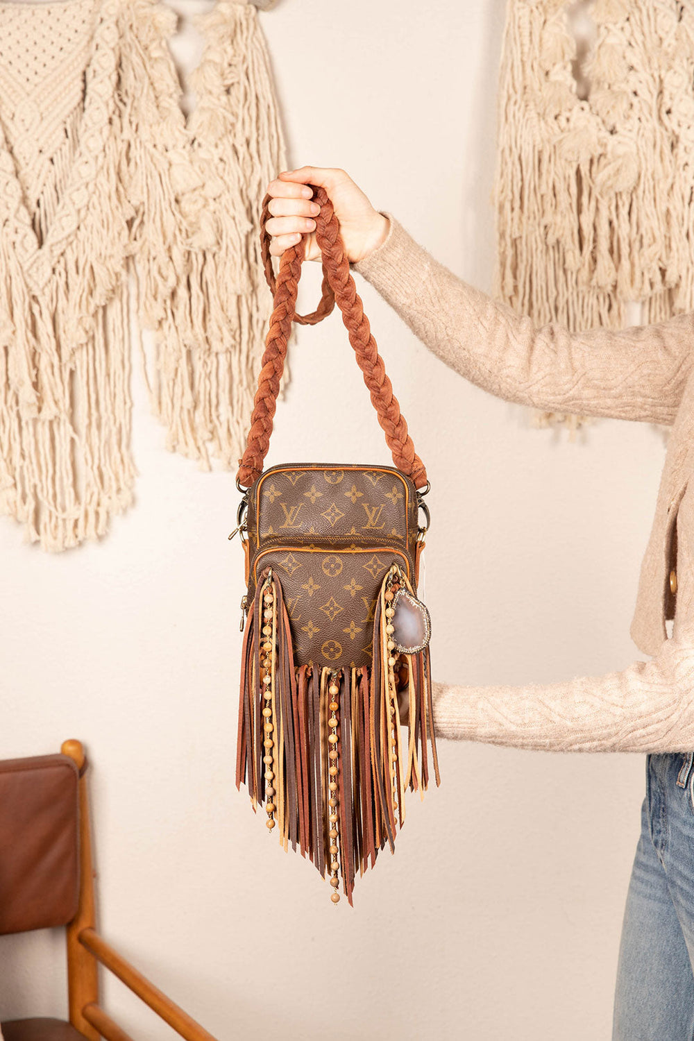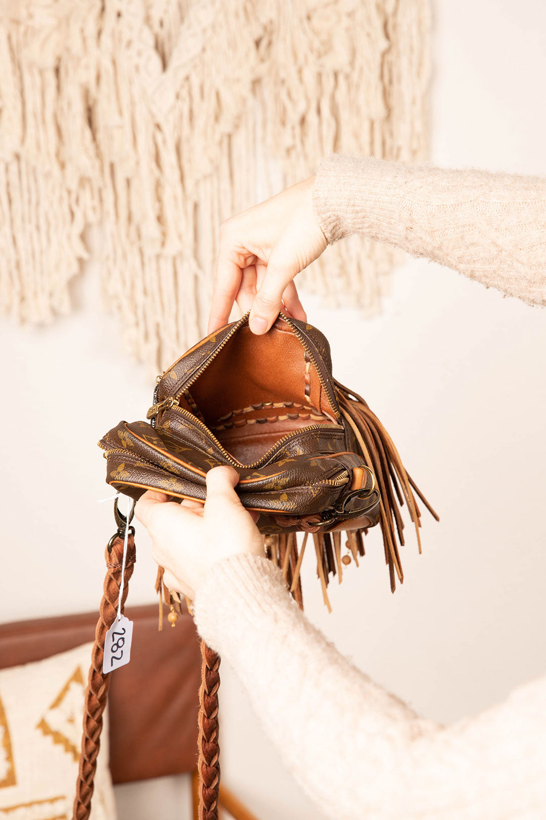 This is an authentic monogram Louis Vuitton crossbody bag, measuring 8 x 6 x 4 inches. It is a two-compartment bag with zippers on the main and front compartment to protect all your essentials. All bags are authenticated, lovingly cleaned, restored and enhanced with our beautiful leather fringe and/or braiding by hand here in the United States!