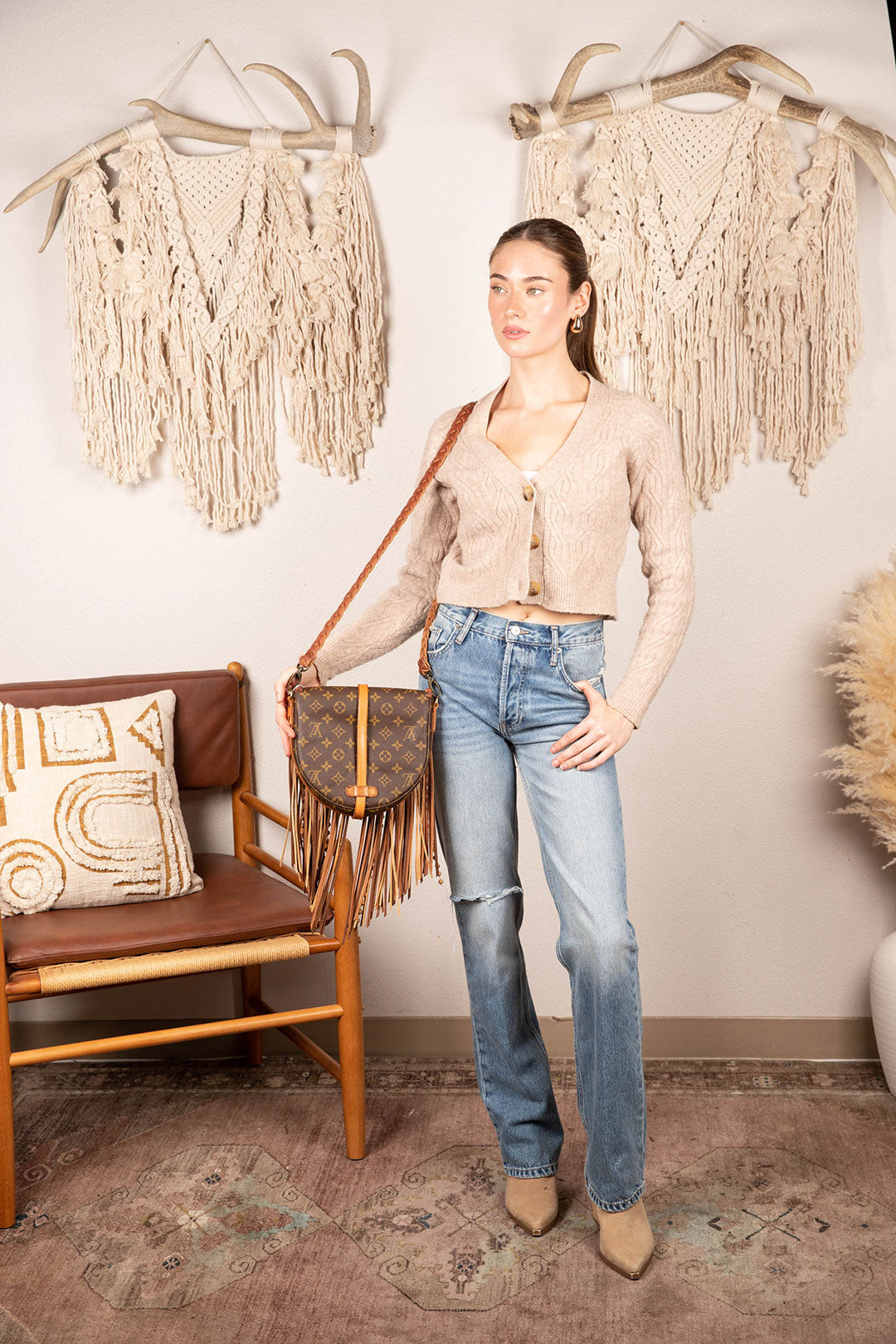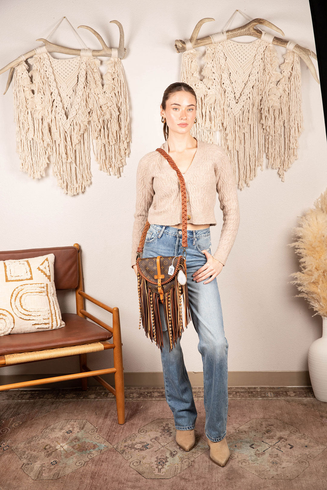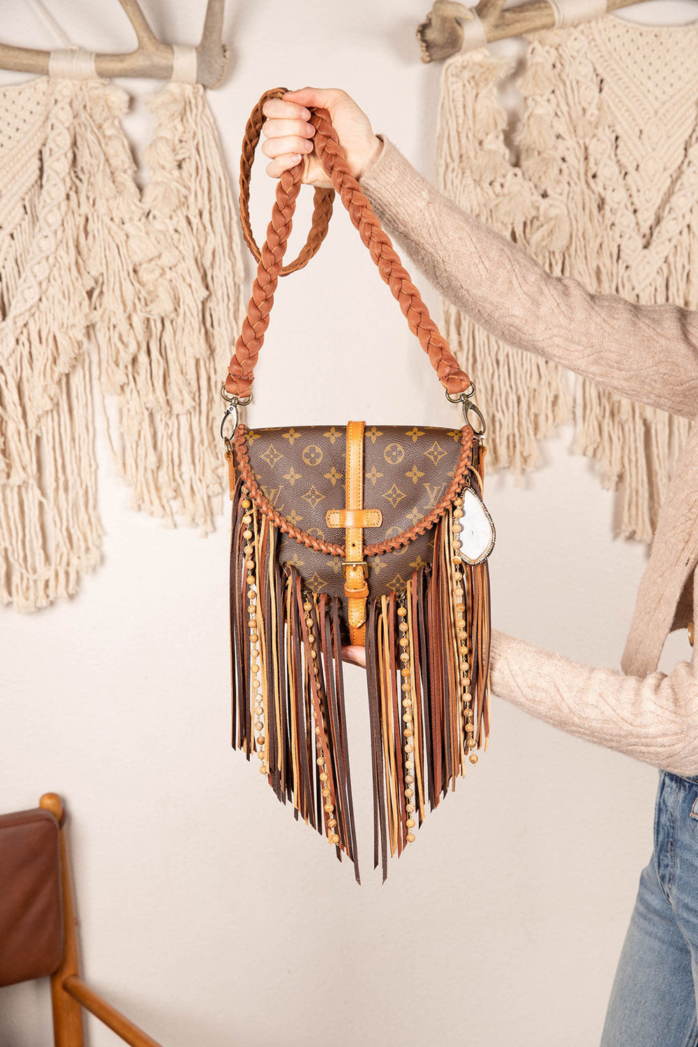 This is an authentic Iconic Louis Vuitton bag, measuring 9.1 x 7.9 x 2 inches cross body bag with front buckle closure. It is distinctly shaped with a spacious inside to carry all basic essentials. All bags are authenticated, lovingly cleaned, restored and enhanced with our beautiful leather fringe and/or braiding by hand here in the United States!