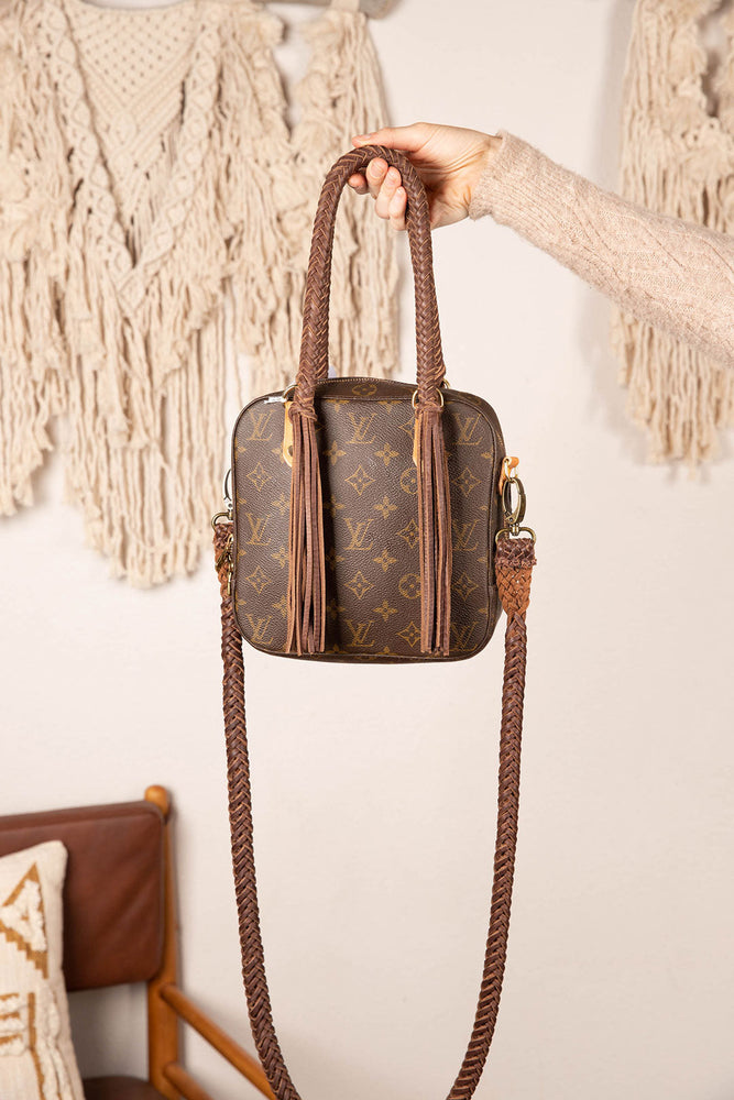 This is an authentic Louis Vuitton bag, measuring 7.9 x 7.9 x 3.9 inches. This is an elegant handbag that is easy to carry on your forearm or shoulder. It has one pocket inside the bag, a zippered top closure and front pocket It will fit an iPad with a case and your other daily essentials. All bags are authenticated, lovingly cleaned, restored and straps enhanced with our beautiful leather braiding by hand here in the United States!