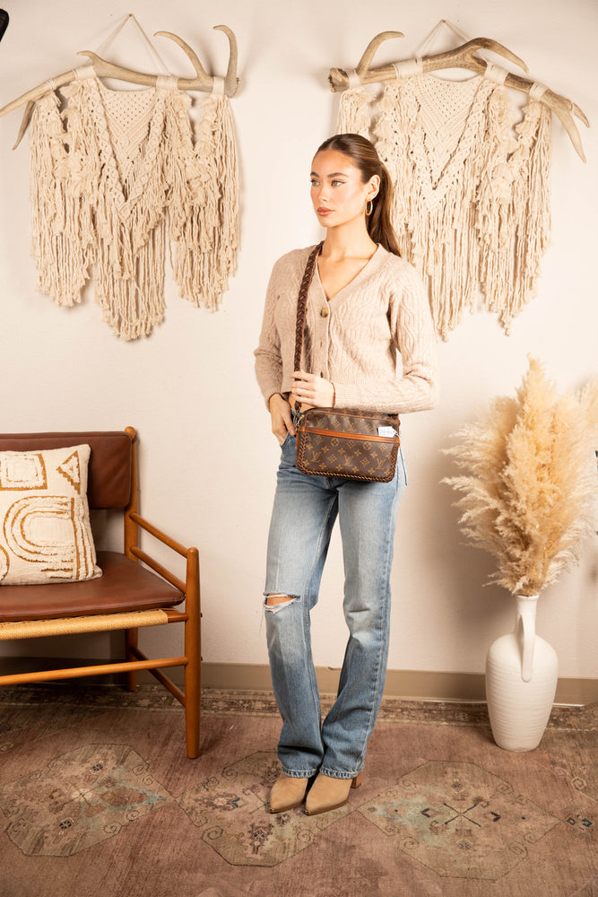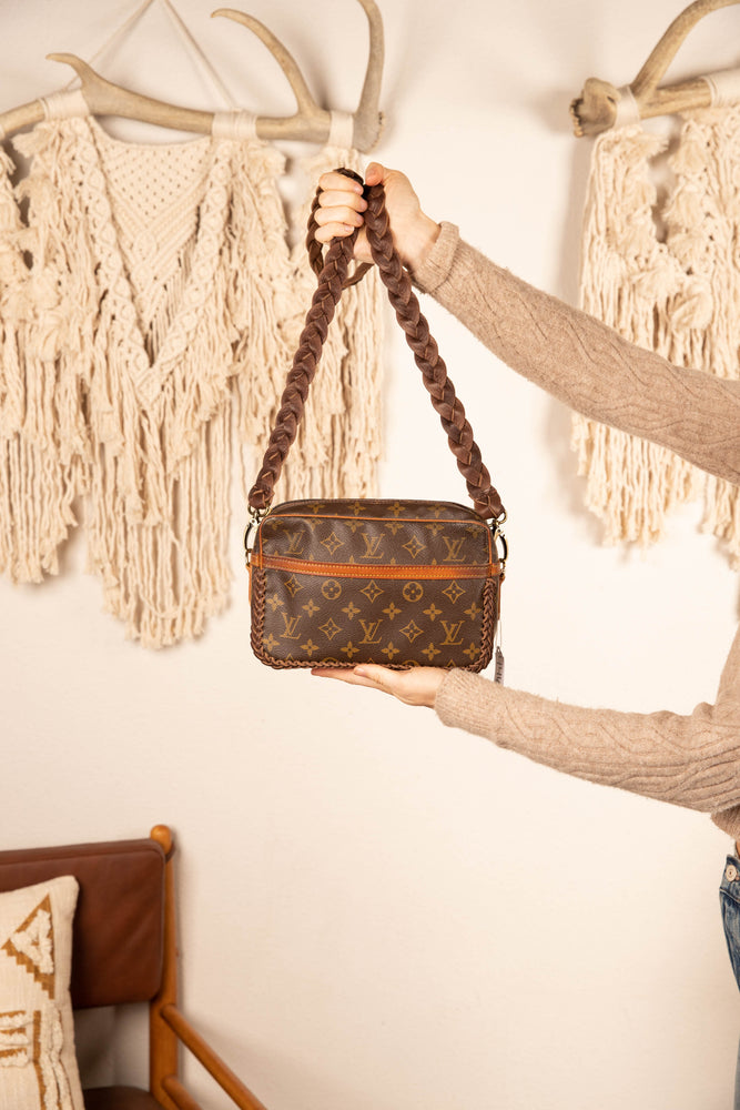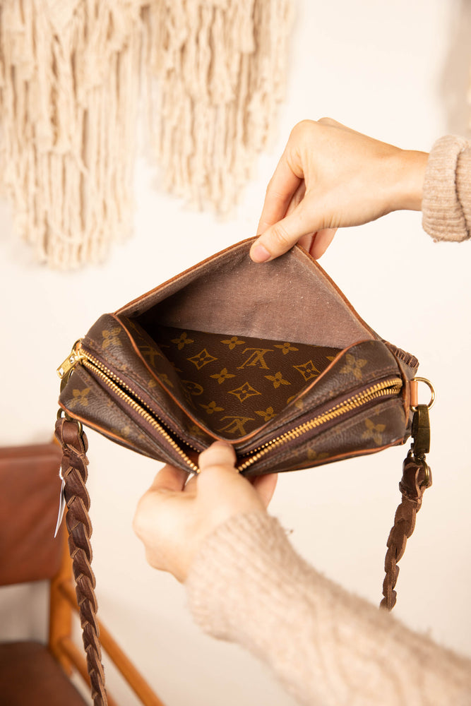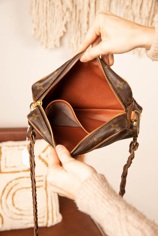 This is an authentic Louis Vuitton cross body bag, measuring 9 x 6 x 2 inches. It has a zippered main compartment an inside pocket and an open front pocket for your cellphone. The inside has pocket dividers to hold all your essentials. All bags are authenticated, lovingly cleaned, restored and enhanced with our beautiful leather fringe and/or braiding by hand here in the United States!
