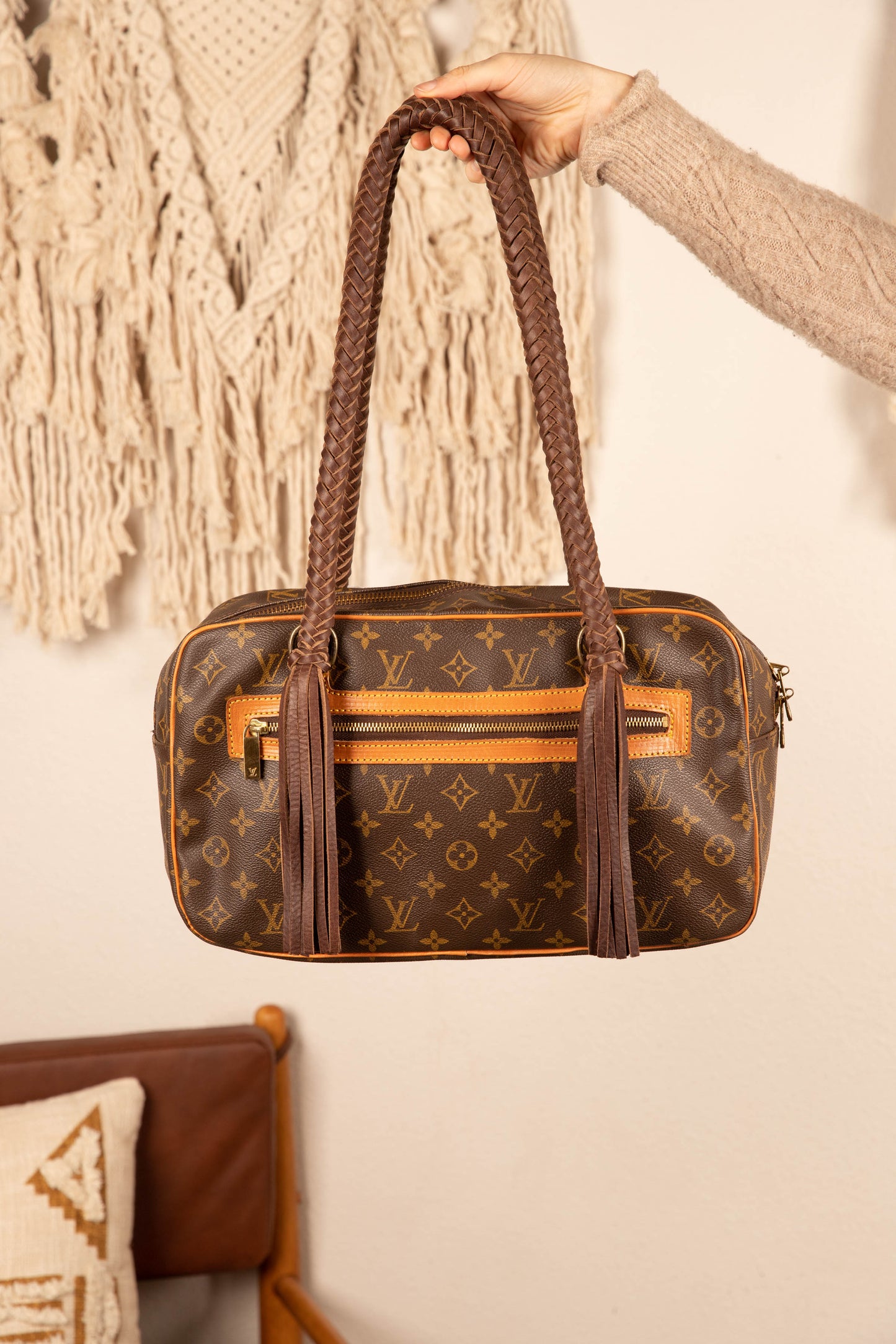 This is an authentic Louis Vuitton bag. It’s a great medium size bag for everyday use. Measuring at 14 x 8.5 x 4 inches. It has a zippered top, front compartment with a flap to protect all your valuables. The inside of the bag has one zippered pocket. All bags are authenticated, lovingly cleaned, restored and enhanced with our beautiful leather fringe and/or braiding by hand here in the United States!