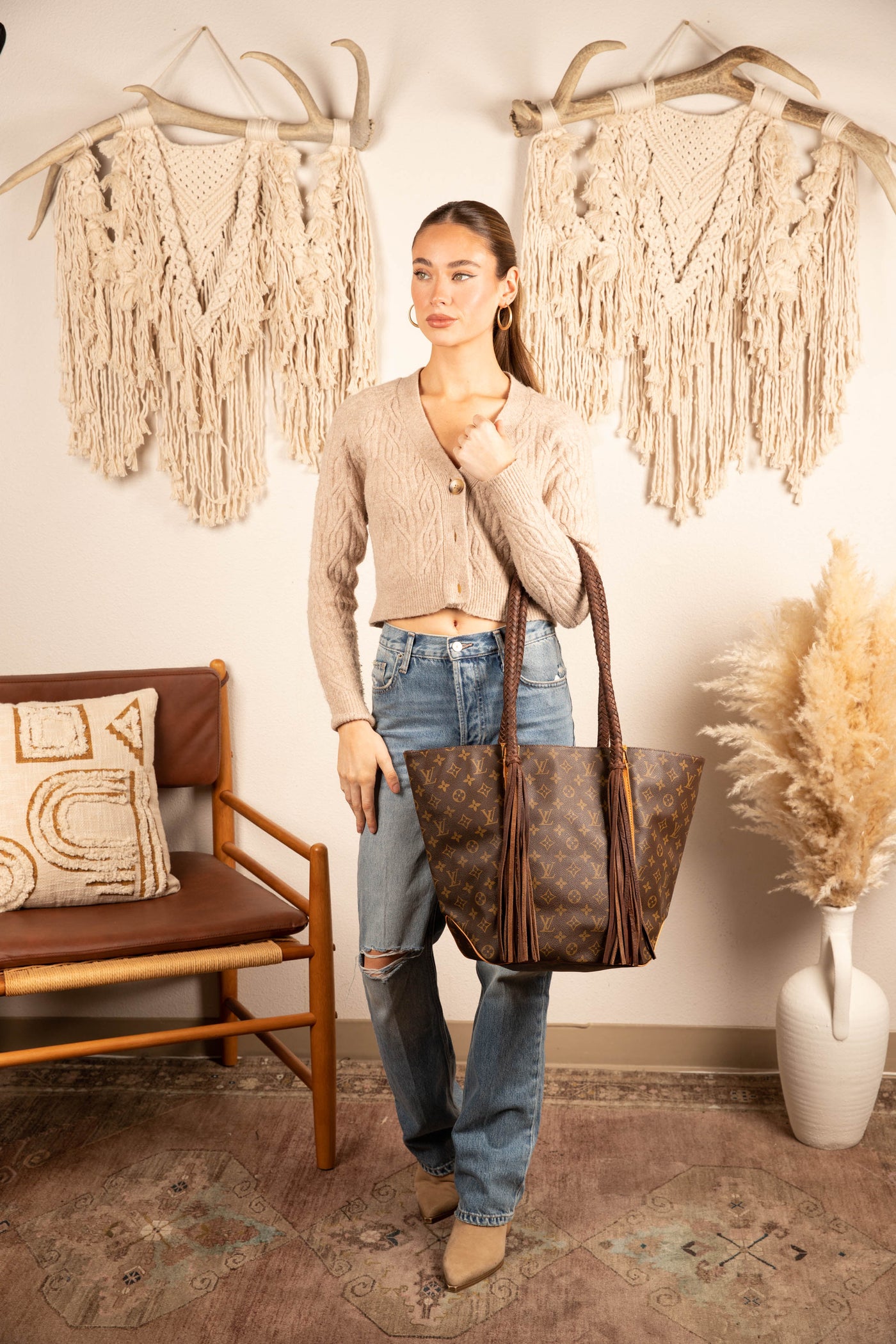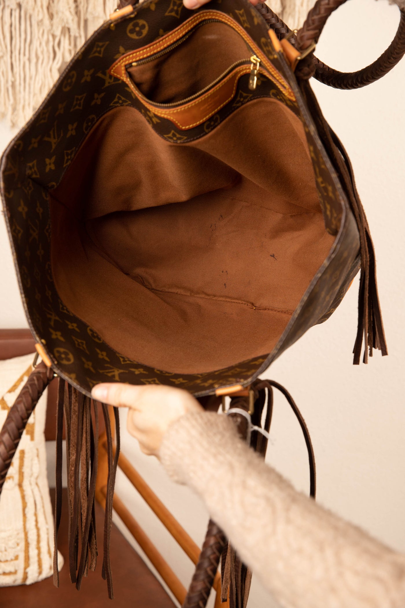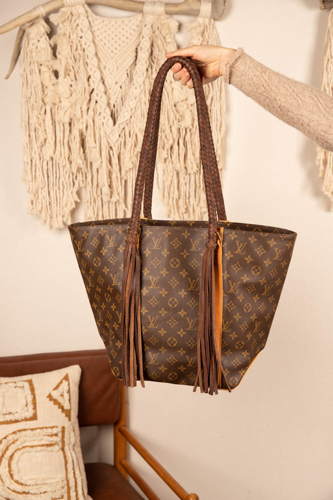 This is an authentic Louis Vuitton bag, measuring 10 x 13.25 x 6 inches. It is an open top with one interior zippered pocket to secure your valuables. Great for travel with its ultra roomy but never bulky style for your essentials. All bags are authenticated, lovingly cleaned, restored and enhanced with our beautiful leather braided handles, by hand here in the United States!
