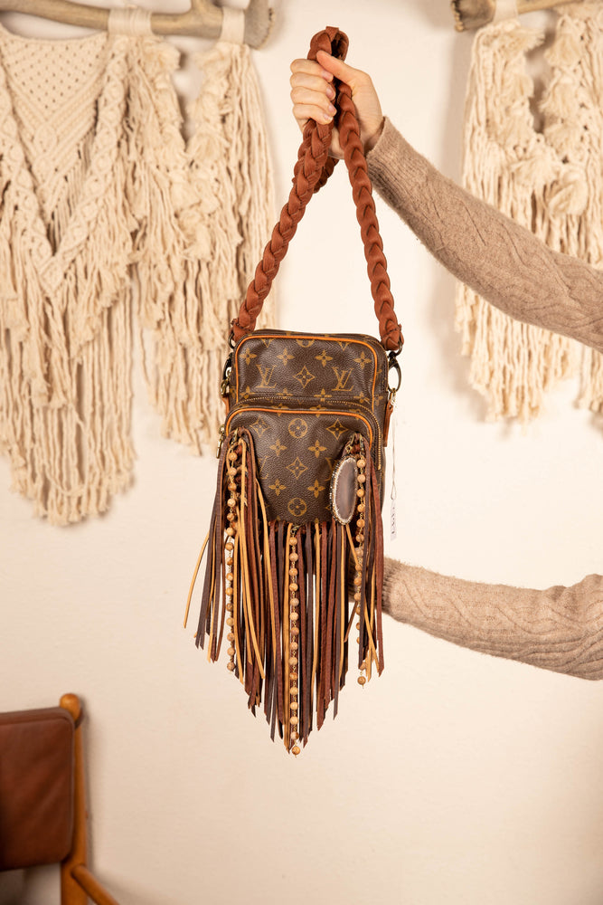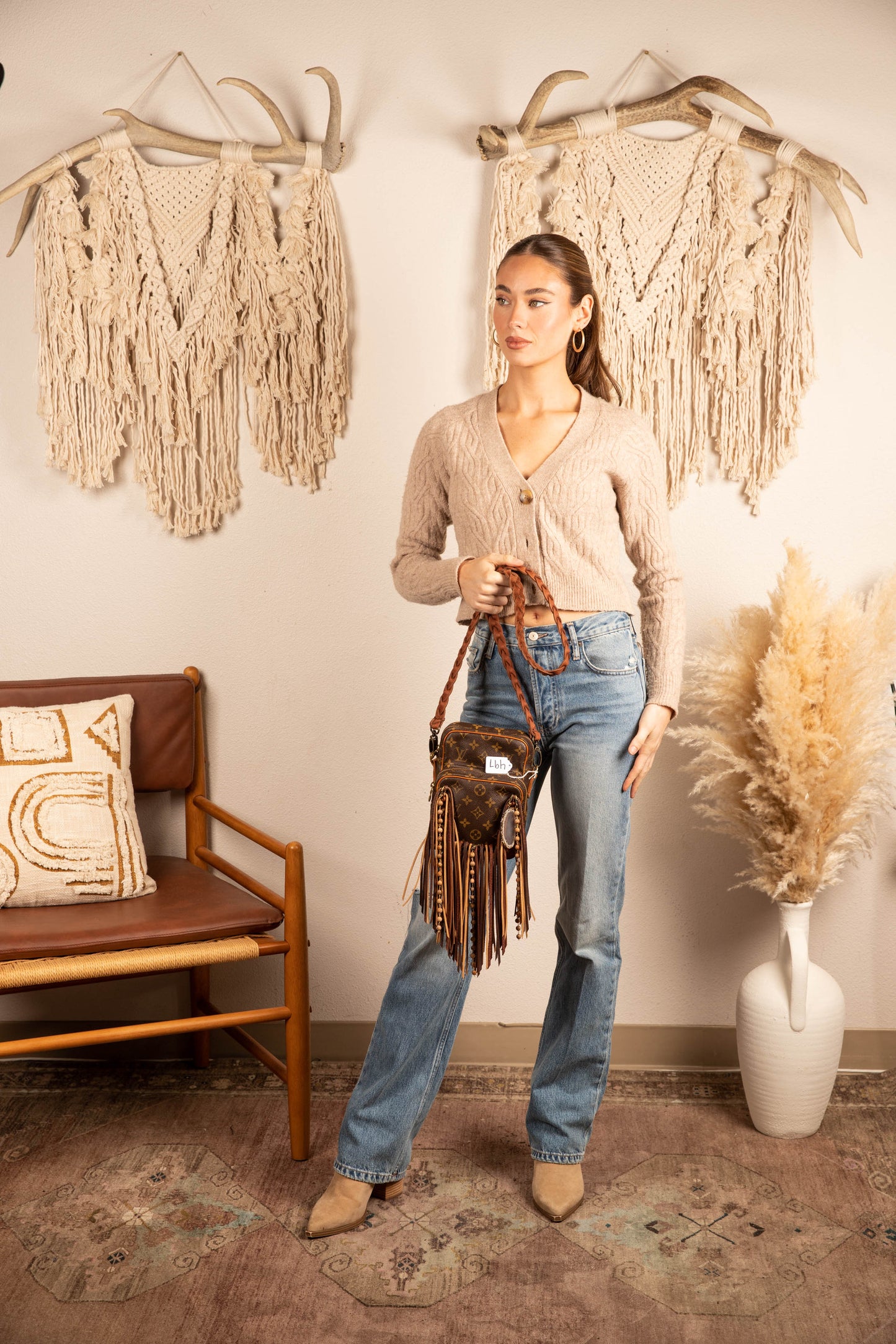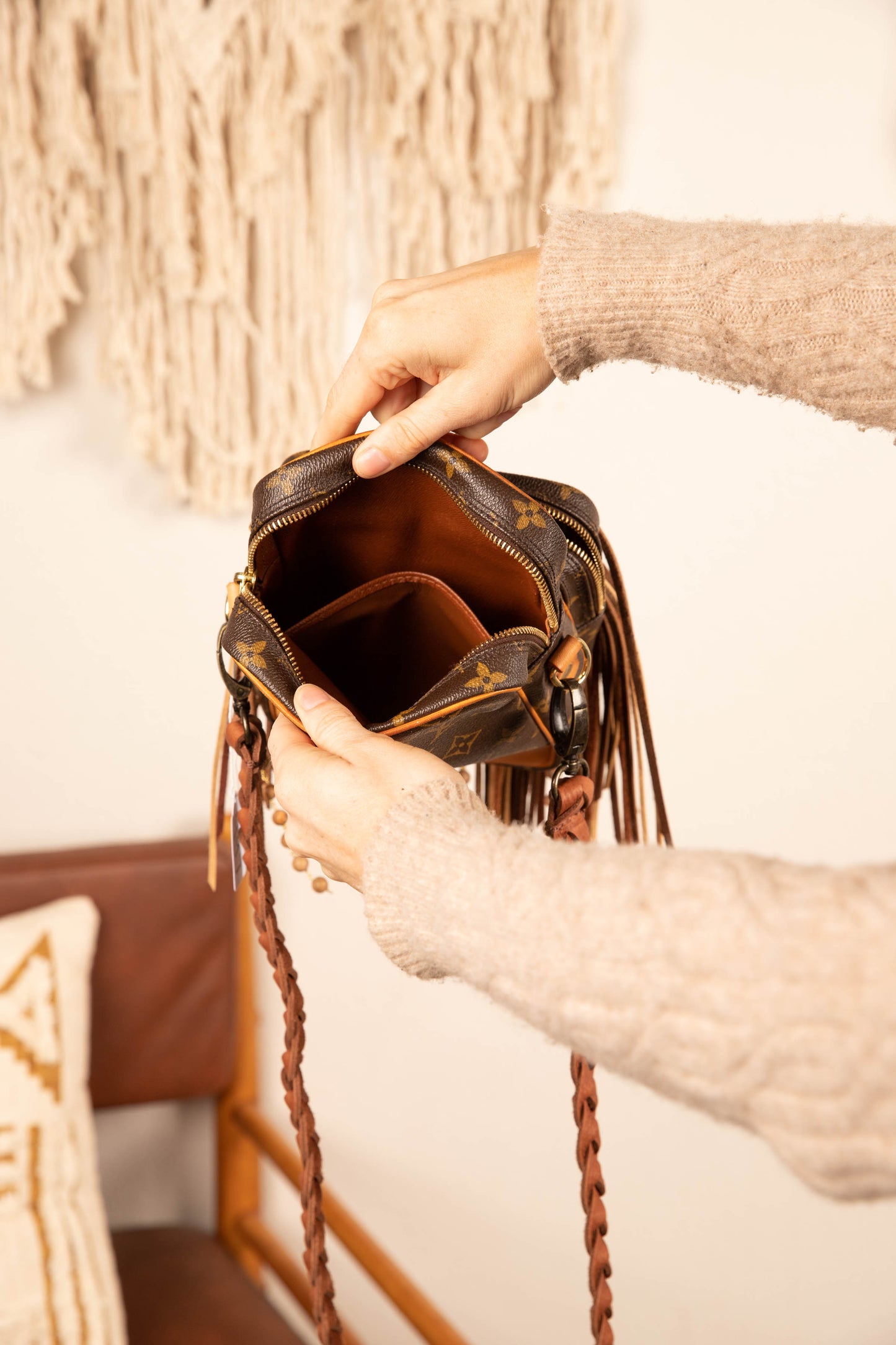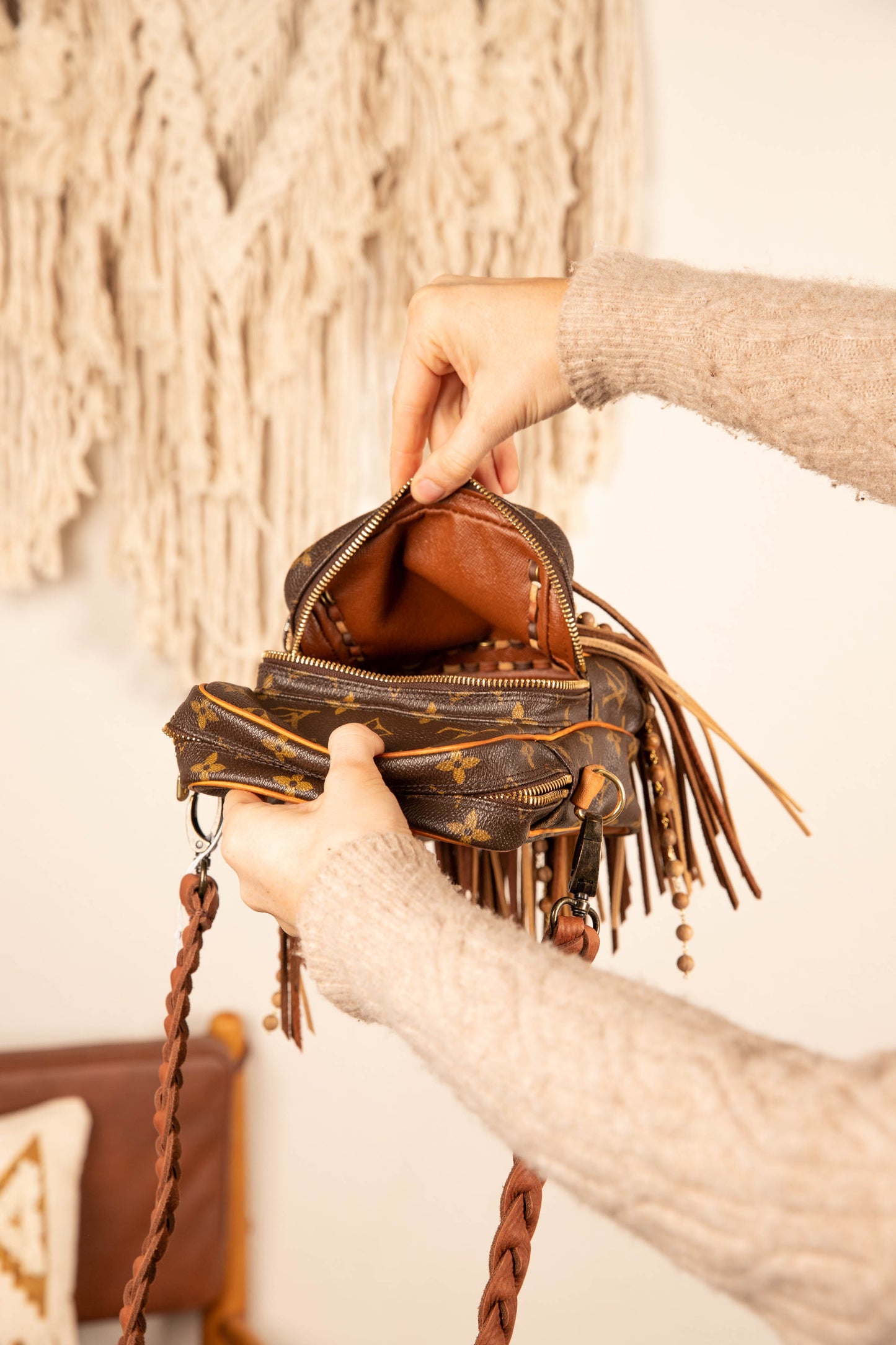 This is an authentic monogram Louis Vuitton crossbody bag, measuring 8 x 6 x 4 inches. It is a two-compartment bag with zippers on the main and front compartment to protect all your essentials. All bags are authenticated, lovingly cleaned, restored and enhanced with our beautiful leather fringe and/or braiding by hand here in the United States!