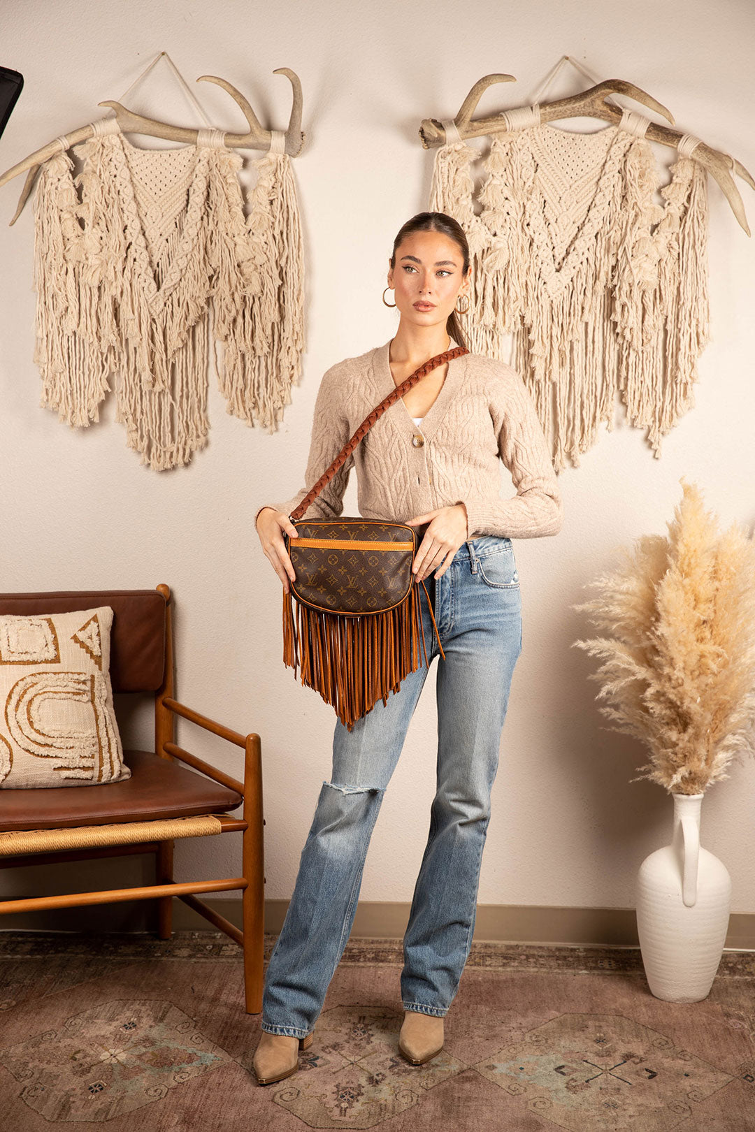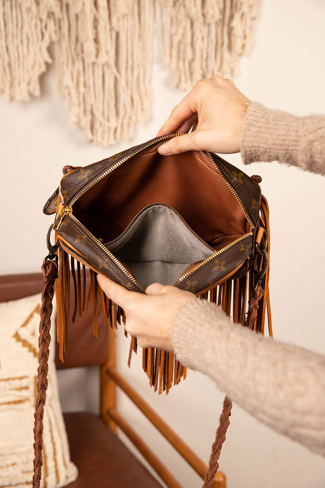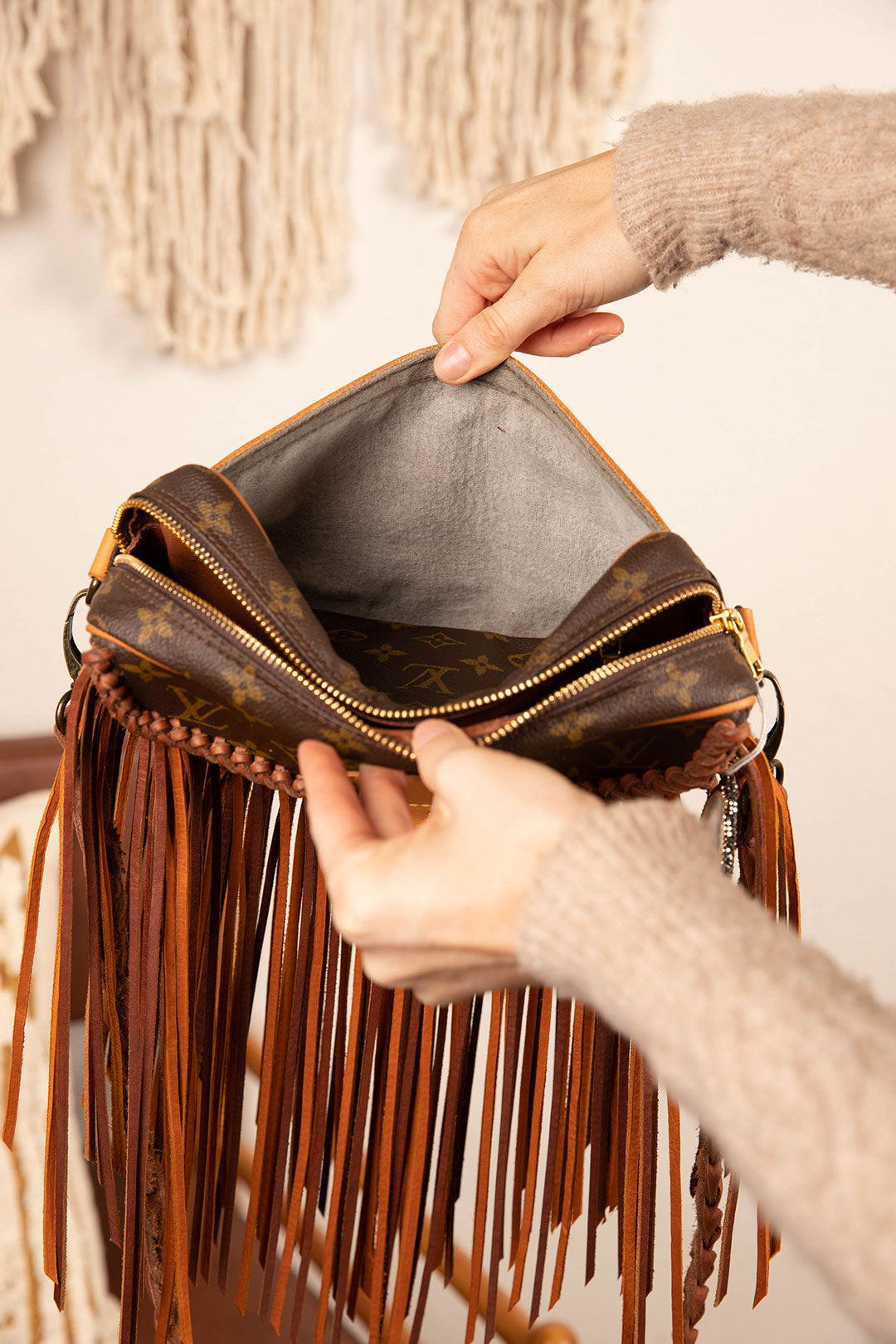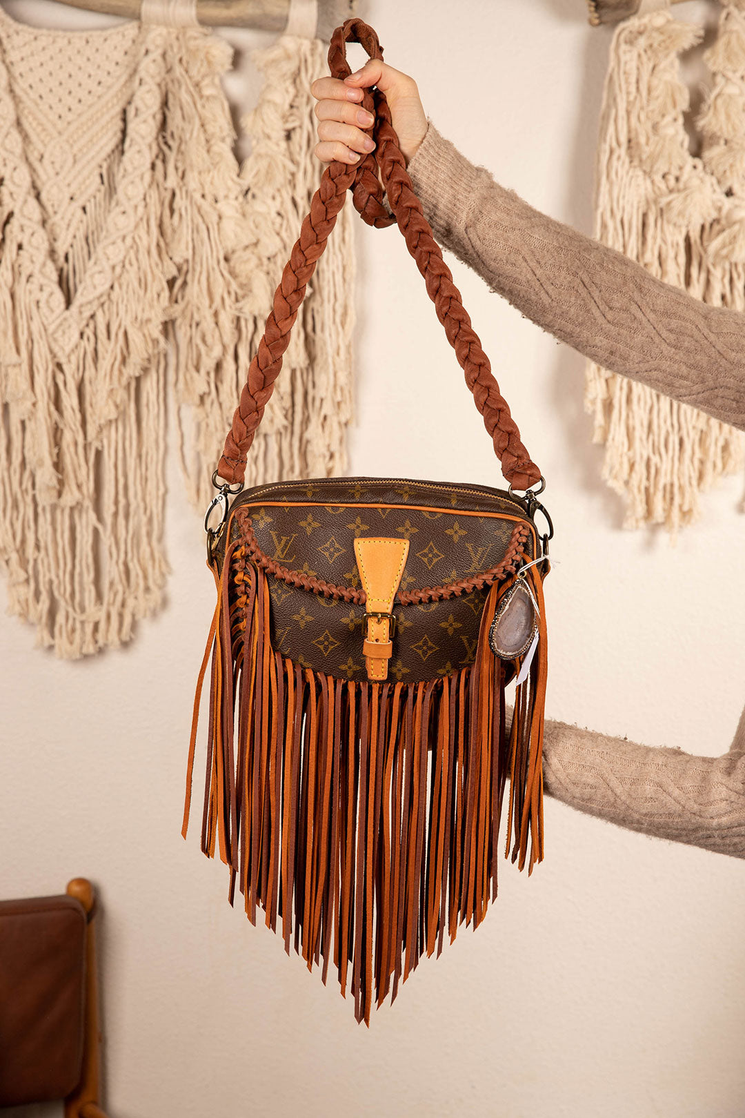 This is an authentic Louis Vuitton cross body bag, measuring 10 x 7.25 x 2. inches. Large bag and will hold all essentials plus more. Zippered main compartment with an open front pocket. All bags are authenticated, lovingly cleaned, restored and enhanced with our beautiful leather fringe and/or braiding by hand here in the United States!
