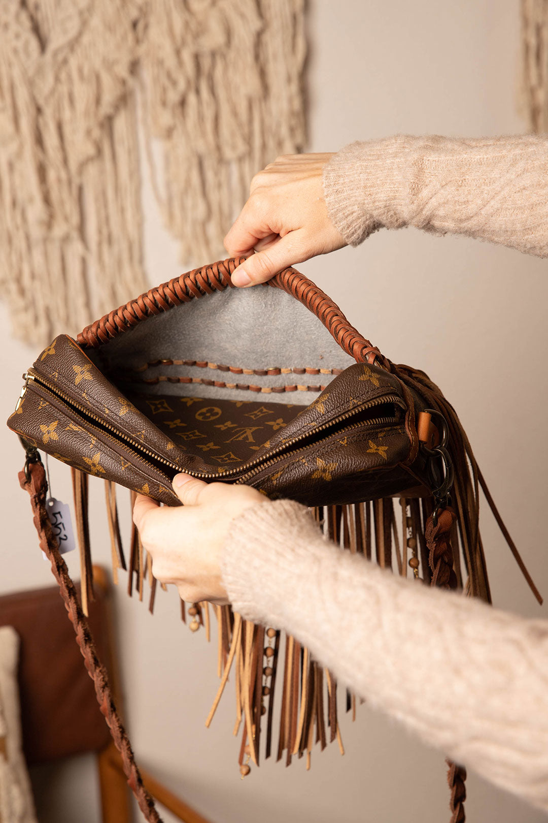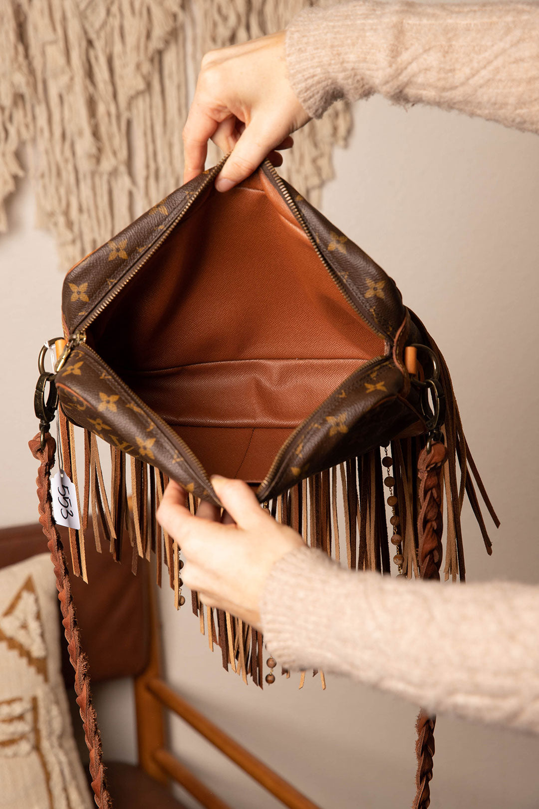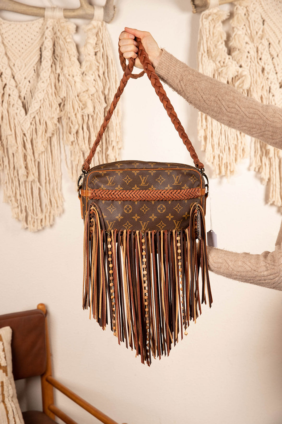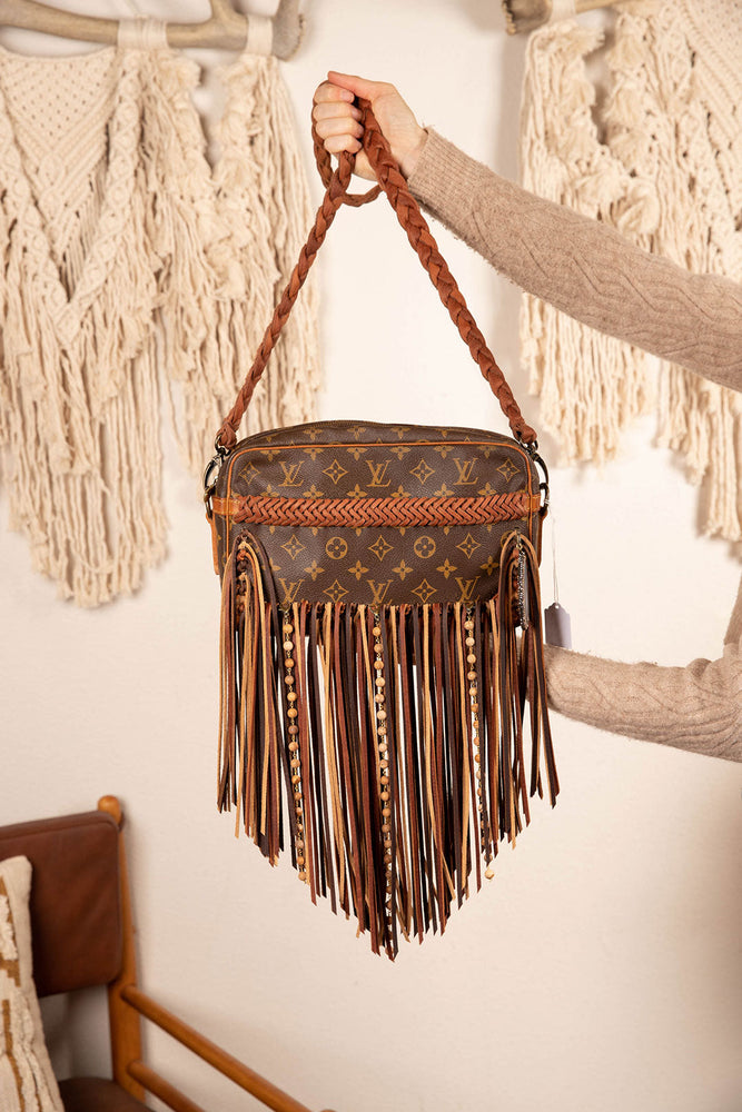 This is an authentic Louis Vuitton cross body bag, measuring 11 x 7 x 2 inches. It has a zippered main compartment and an open front pocket for your cellphone. The inside has pocket dividers to hold all your essentials. All bags are authenticated, lovingly cleaned, restored and enhanced with our beautiful leather fringe and/or braiding by hand here in the United States!
