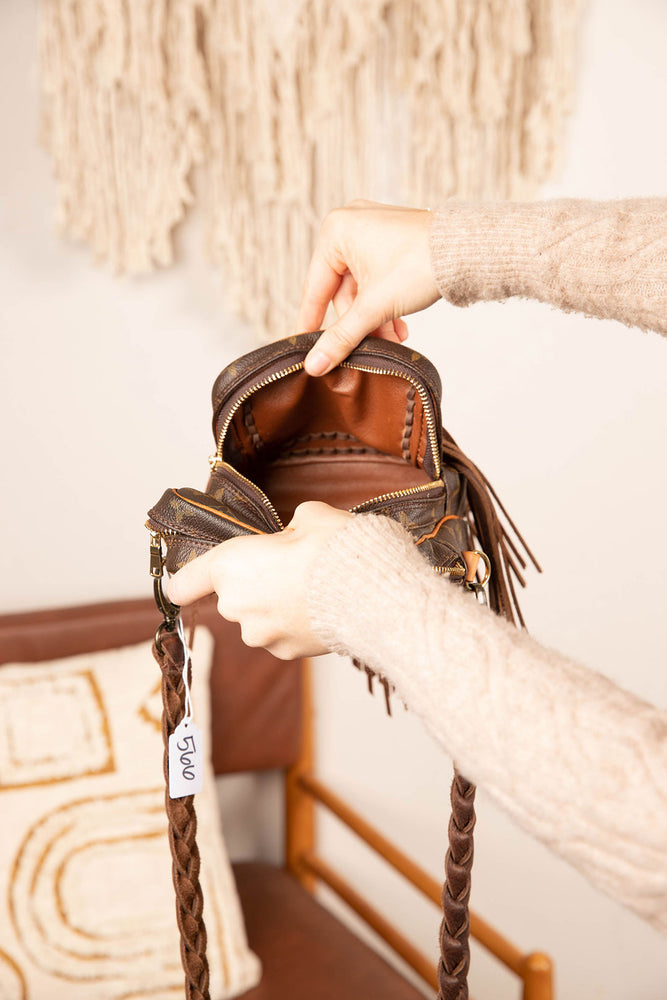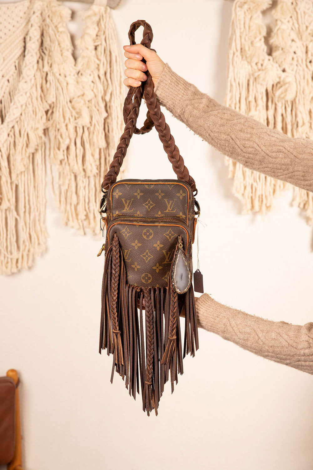 This is an authentic monogram Louis Vuitton crossbody bag, measuring 8 x 6 x 4 inches. It is a two-compartment bag with zippers on the main and front compartment to protect all your essentials. All bags are authenticated, lovingly cleaned, restored and enhanced with our beautiful leather fringe and/or braiding by hand here in the United States!