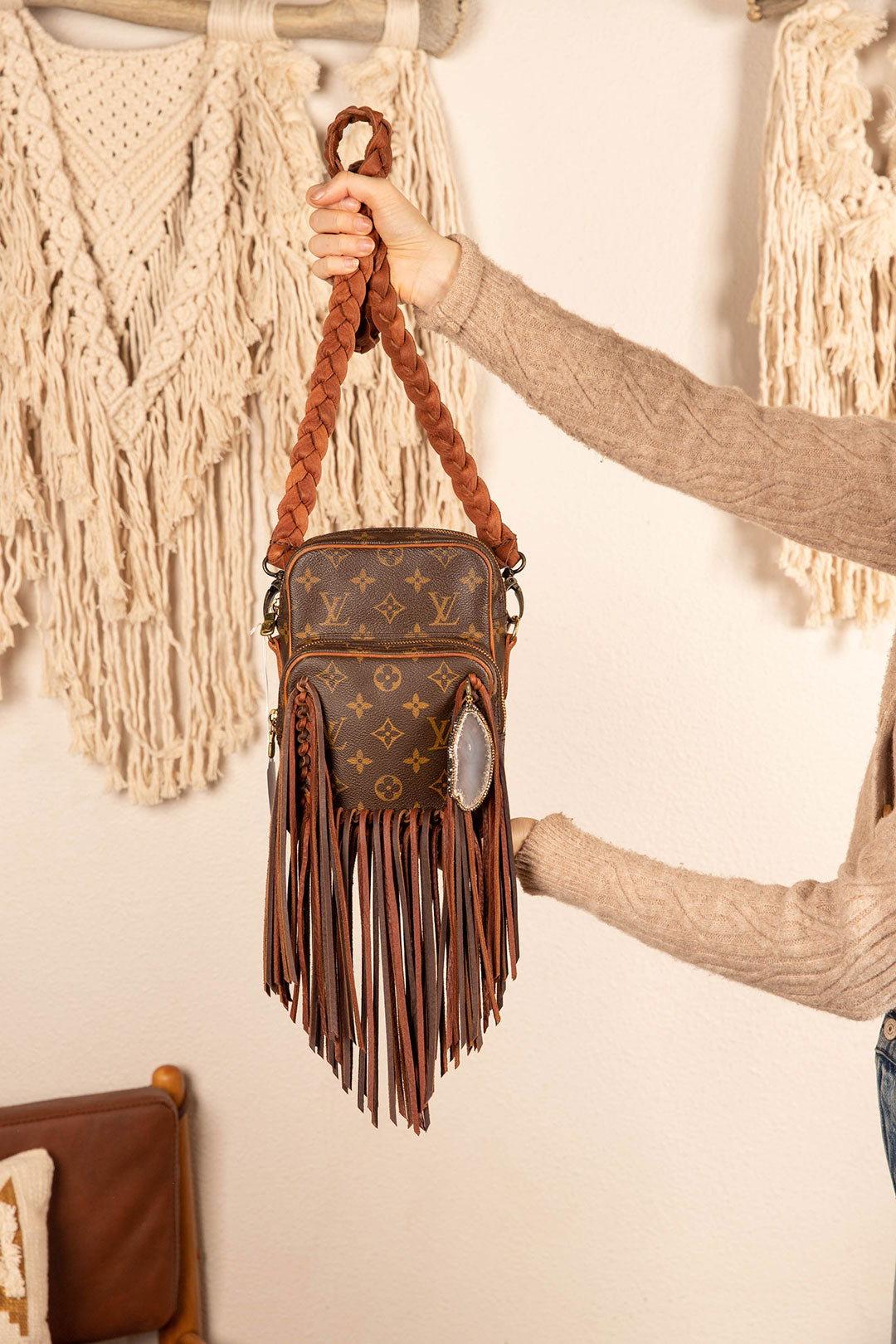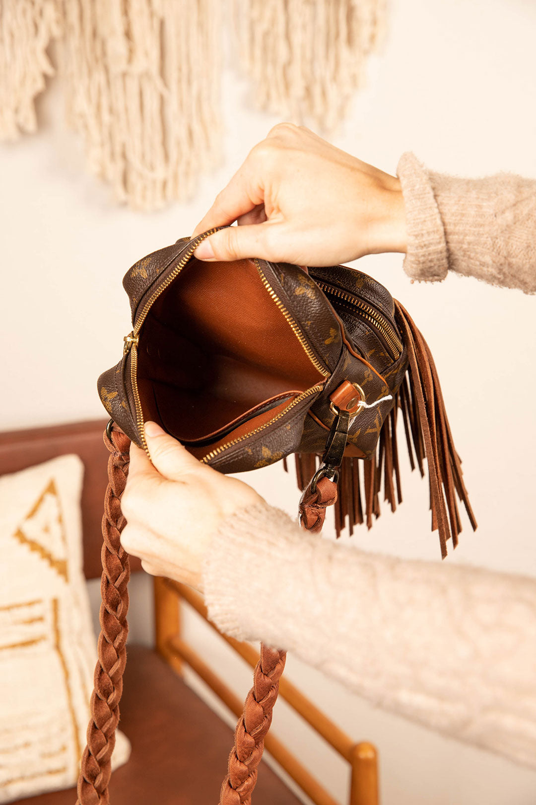 This is an authentic monogram Louis Vuitton crossbody bag, measuring 8 x 6 x 4 inches. It is a two-compartment bag with zippers on the main and front compartment to protect all your essentials. All bags are authenticated, lovingly cleaned, restored and enhanced with our beautiful leather fringe and/or braiding by hand here in the United States!