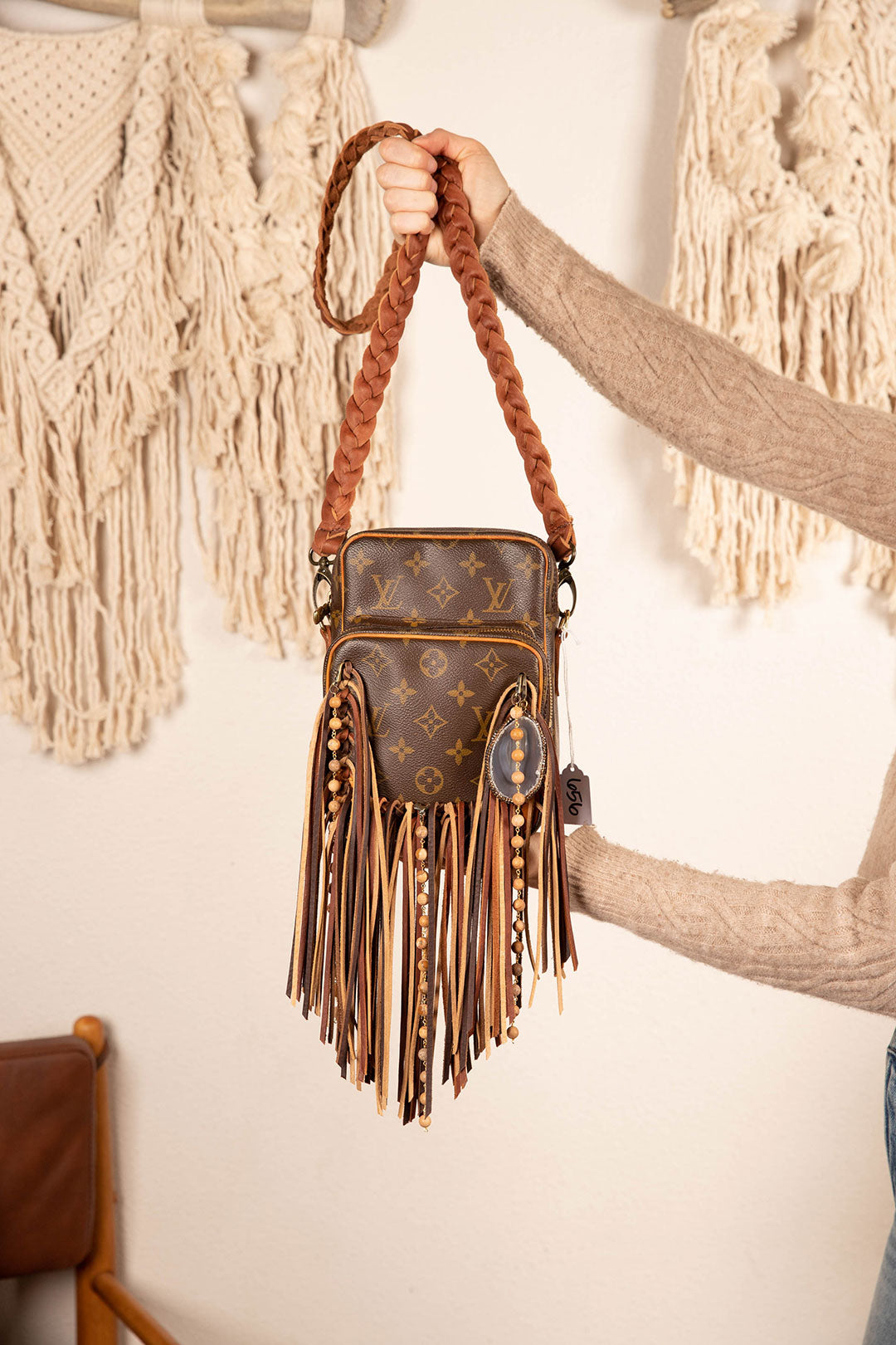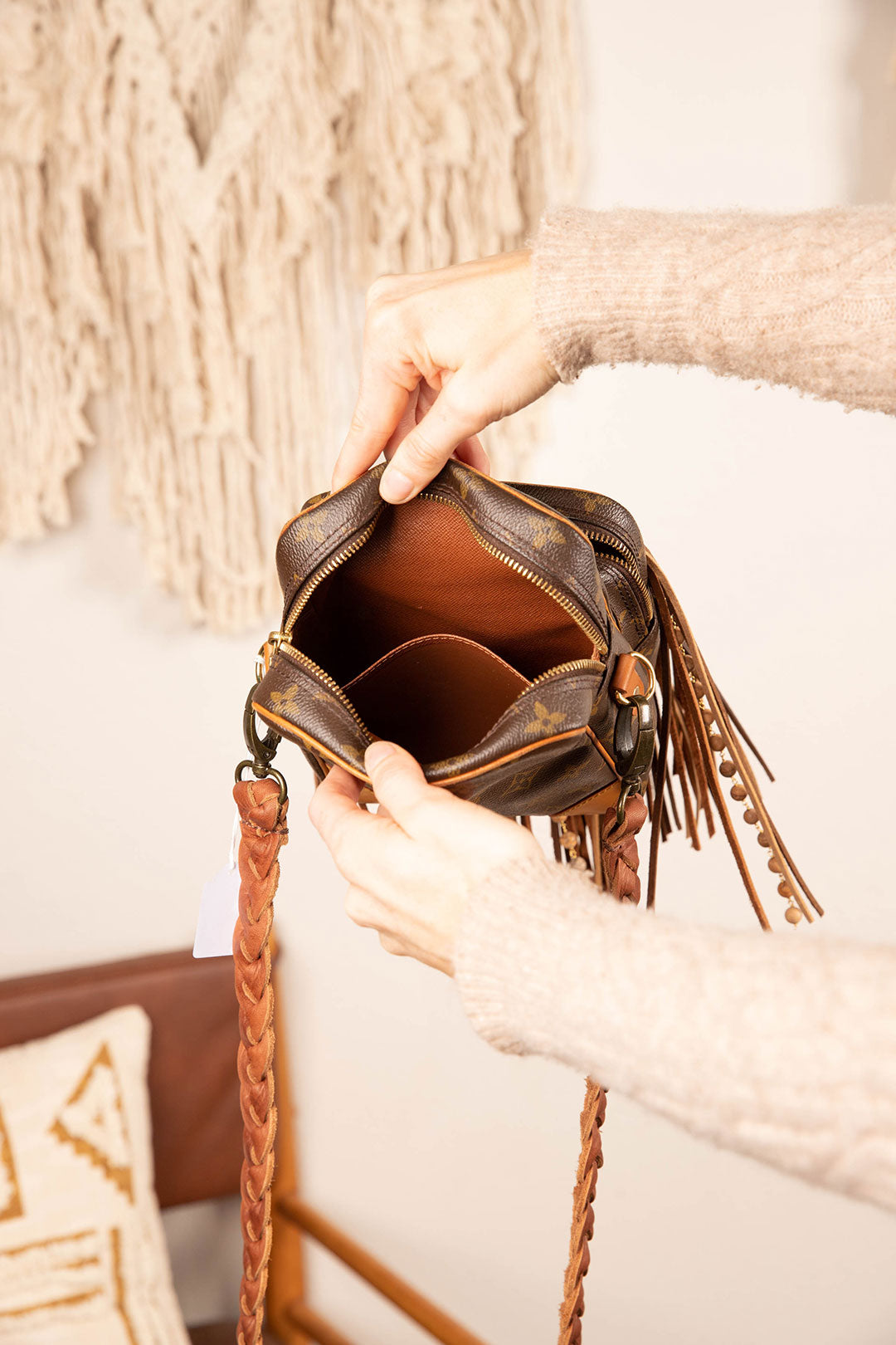 This is an authentic monogram Louis Vuitton crossbody bag, measuring 8 x 6 x 4 inches. It is a two-compartment bag with zippers on the main and front compartment to protect all your essentials. All bags are authenticated, lovingly cleaned, restored and enhanced with our beautiful leather fringe and/or braiding by hand here in the United States!