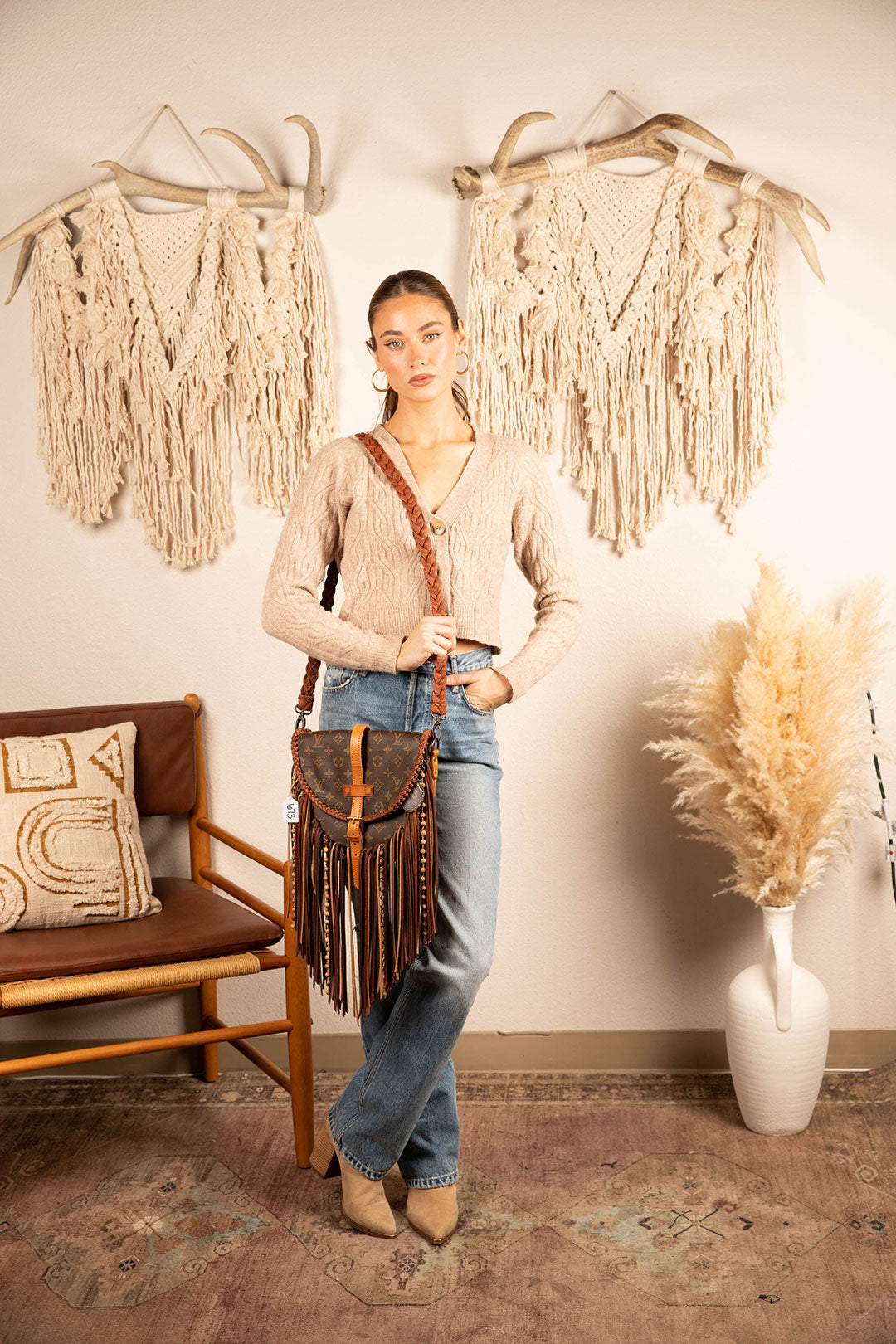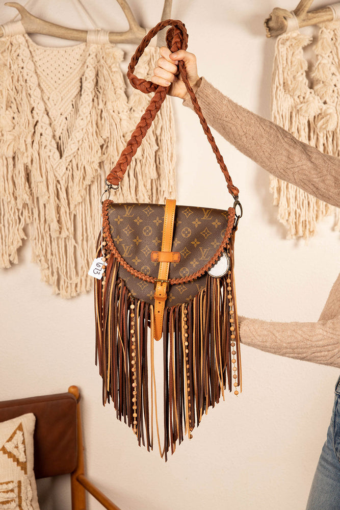 This is an authentic Iconic Louis Vuitton bag. Collector’s piece measuring 9.5 x 9 x 2.7 inches cross body bag with front buckle closure. It is distinctly shaped with a spacious inside to carry all basic essentials. All bags are authenticated, lovingly cleaned, restored and enhanced with our beautiful leather fringe and/or braiding by hand here in the United States!