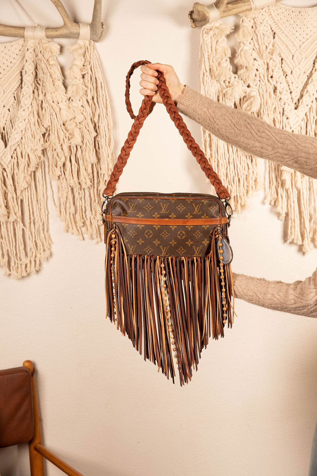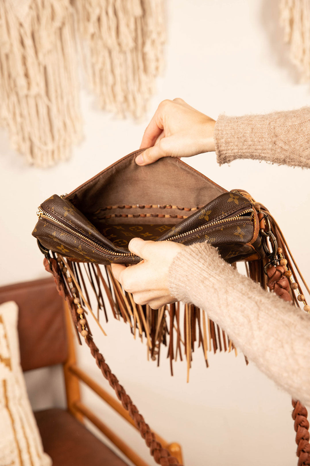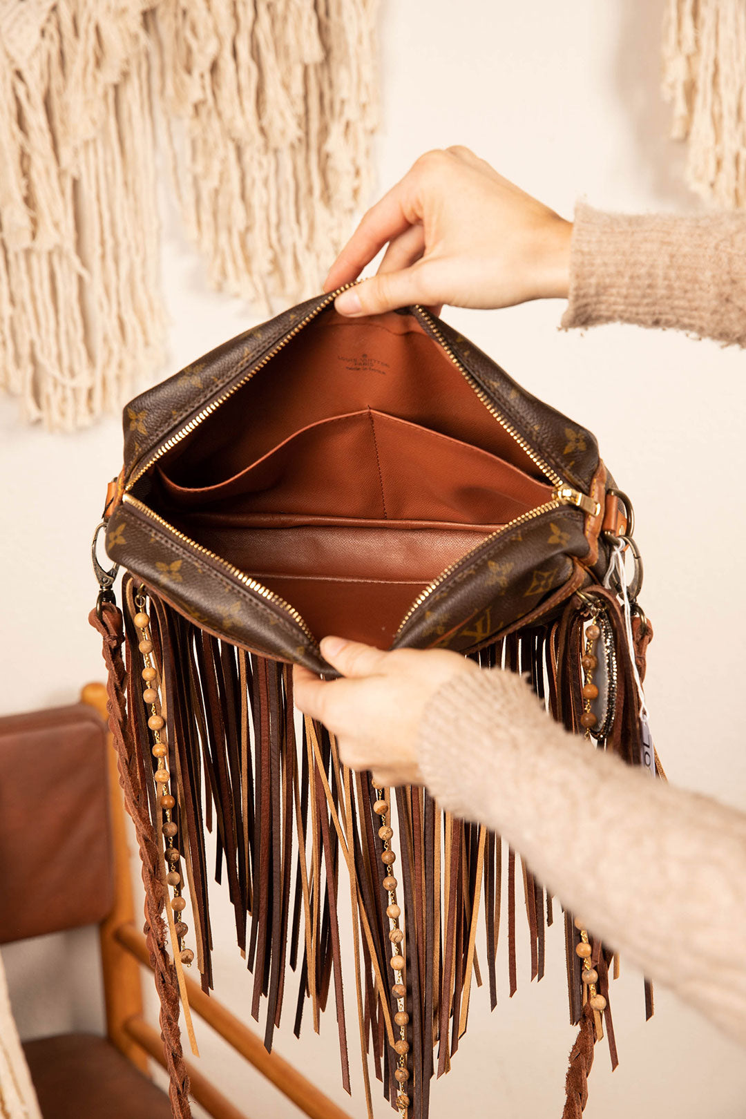 This is an authentic Louis Vuitton cross body bag, measuring 11 x 7 x 2 inches. It has a zippered main compartment and an open front pocket for your cellphone. The inside has pocket dividers to hold all your essentials. All bags are authenticated, lovingly cleaned, restored and enhanced with our beautiful leather fringe and/or braiding by hand here in the United States!