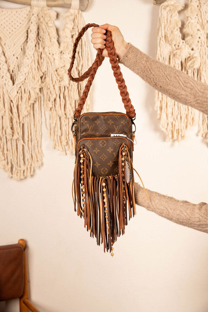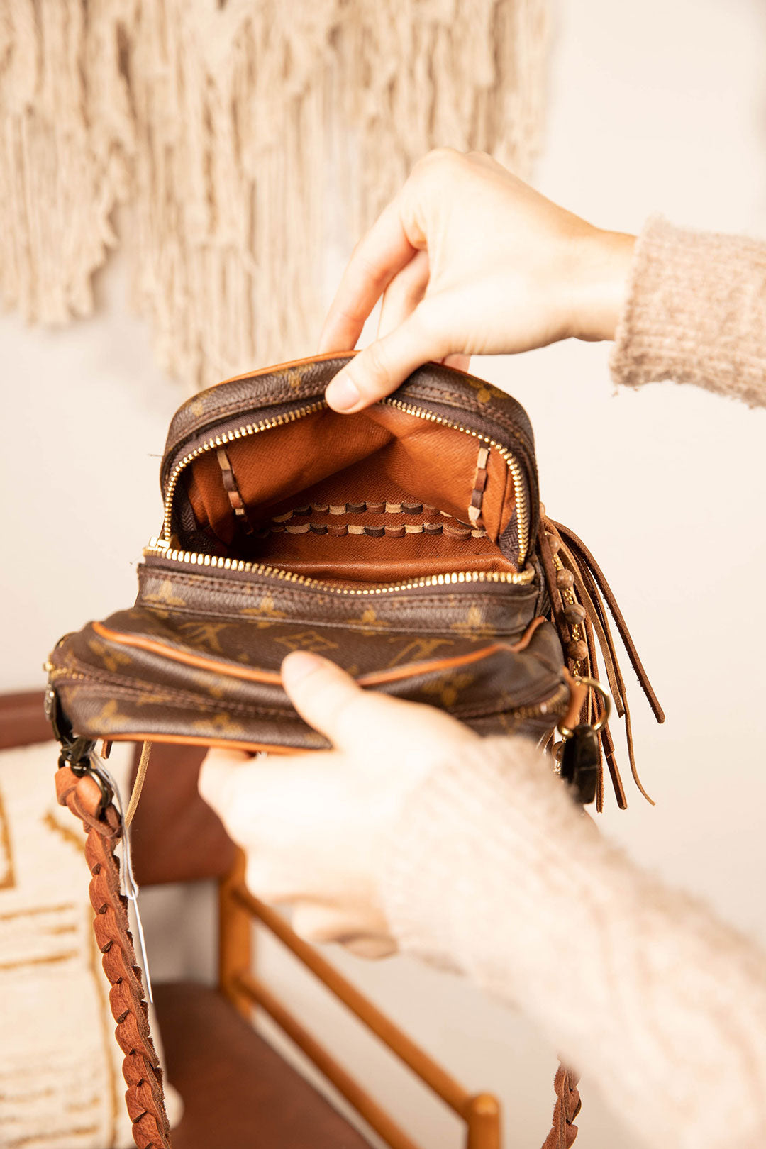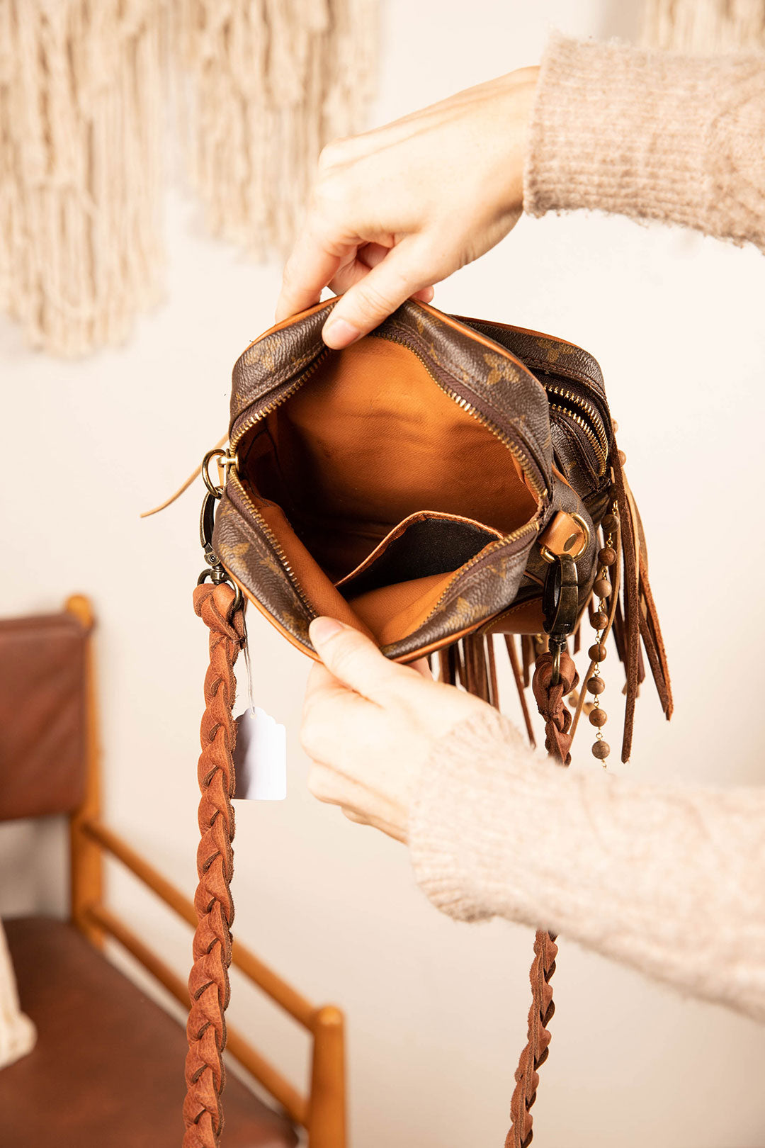 This is an authentic monogram Louis Vuitton crossbody bag, measuring 8 x 6 x 4 inches. It is a two-compartment bag with zippers on the main and front compartment to protect all your essentials. All bags are authenticated, lovingly cleaned, restored and enhanced with our beautiful leather fringe and/or braiding by hand here in the United States!