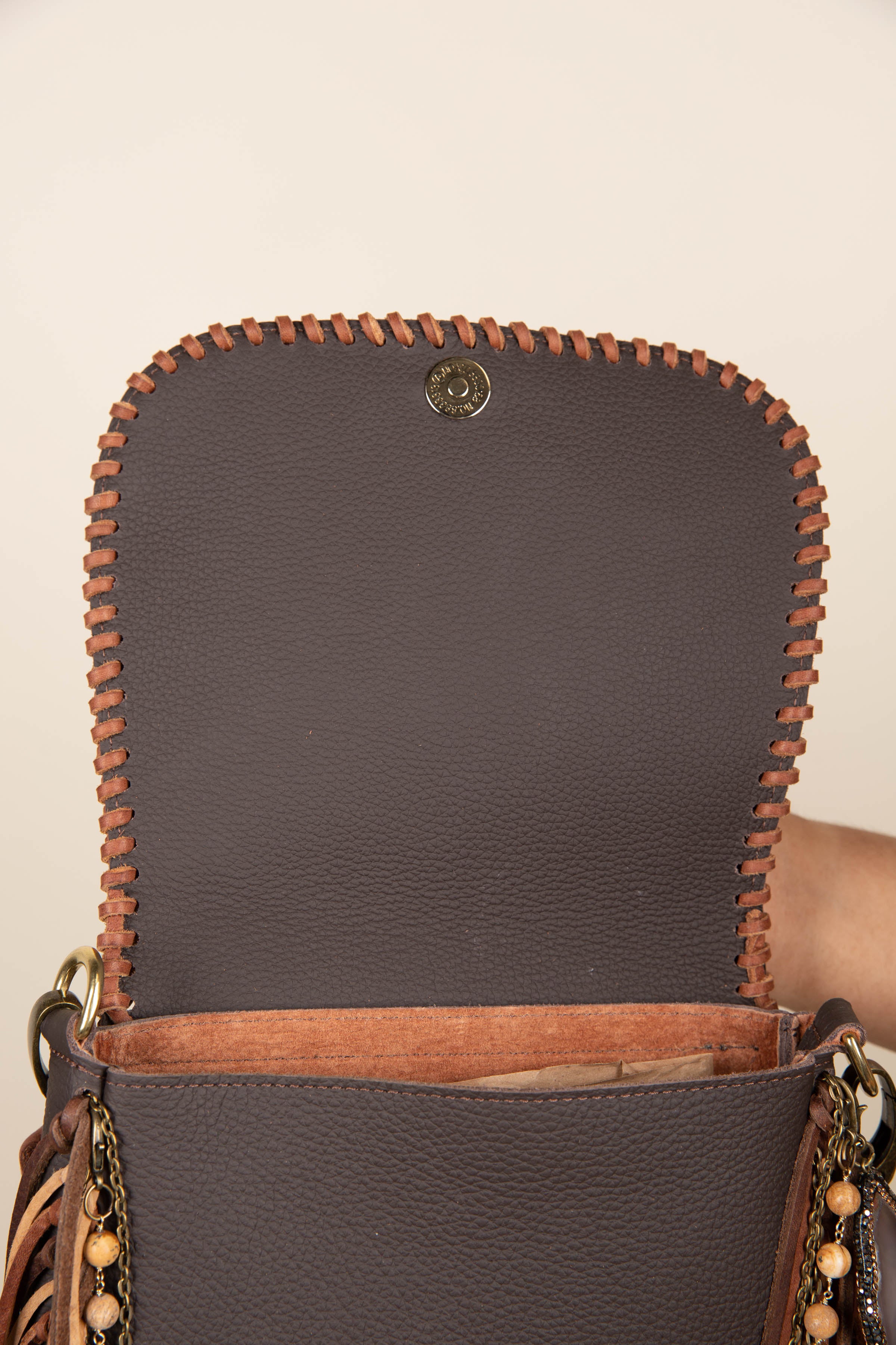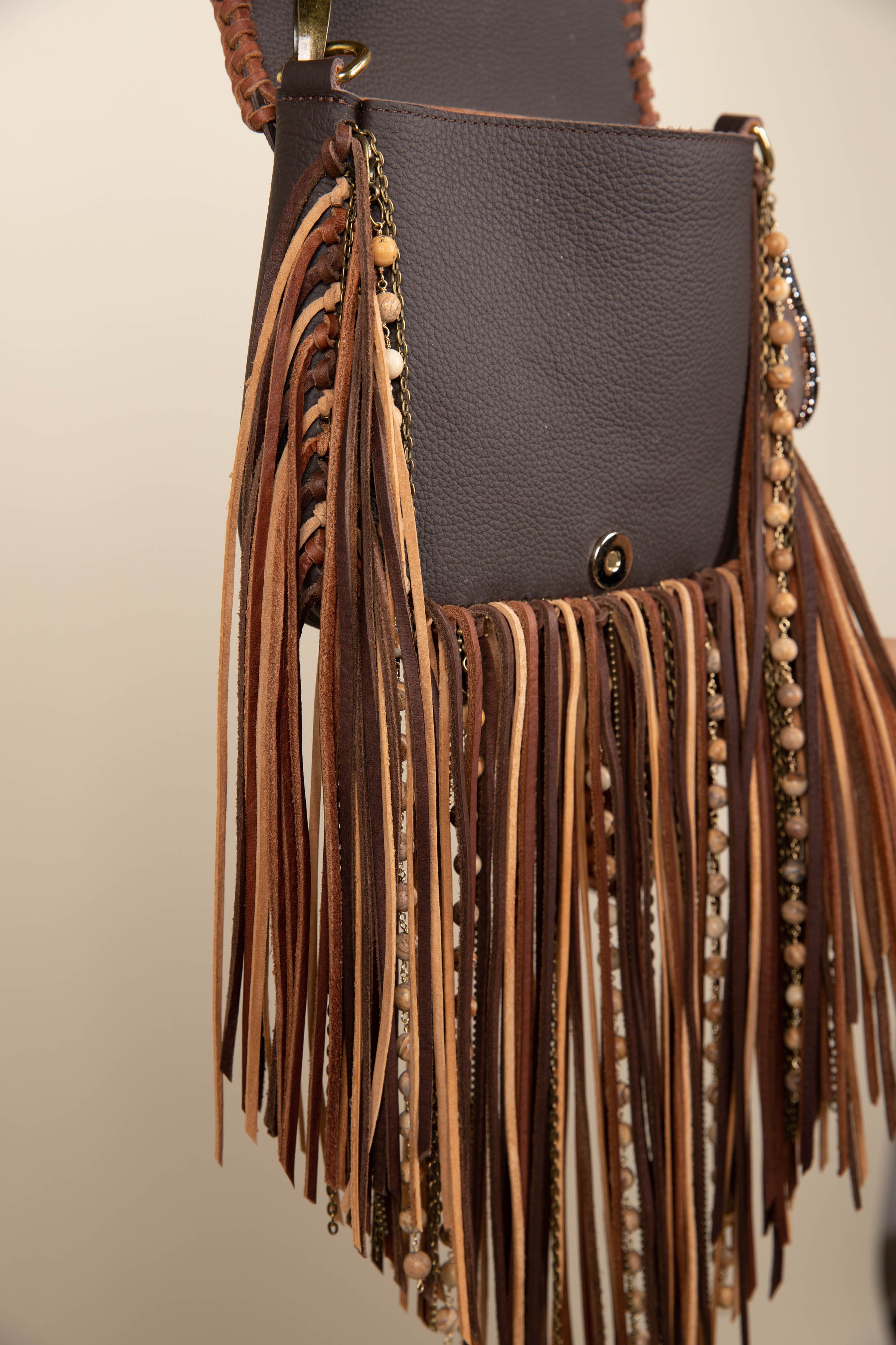 Your Journey starts here and the path has never been easier. Simply select one of the two colors you would like to add for the fringe and braiding around the flap. You may choose the standard fringe length at 13" or the short at 9".